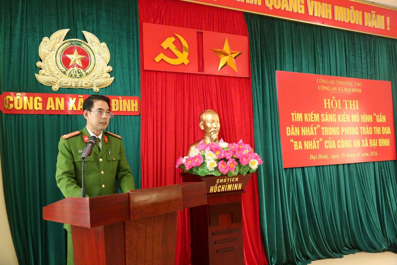 Hòa chung không khí phấn khởi của toàn Đảng, toàn dân, toàn quân chào mừng thành công Đại hội đại biểu toàn quốc lần thứ XIV của Đảng; thực hiện phong trào thi đua “Ba nhất: Kỷ luật nhất - Trung thành nhất - Gần dân nhất” trong Công an nhân dân, chiều ngày 29/01/2026, Công an xã Đại Đình đã tổ chức Hội thi tìm kiếm sáng kiến, mô hình “Gần dân nhất” trong phong trào thi đua “Ba nhất” năm 2026.