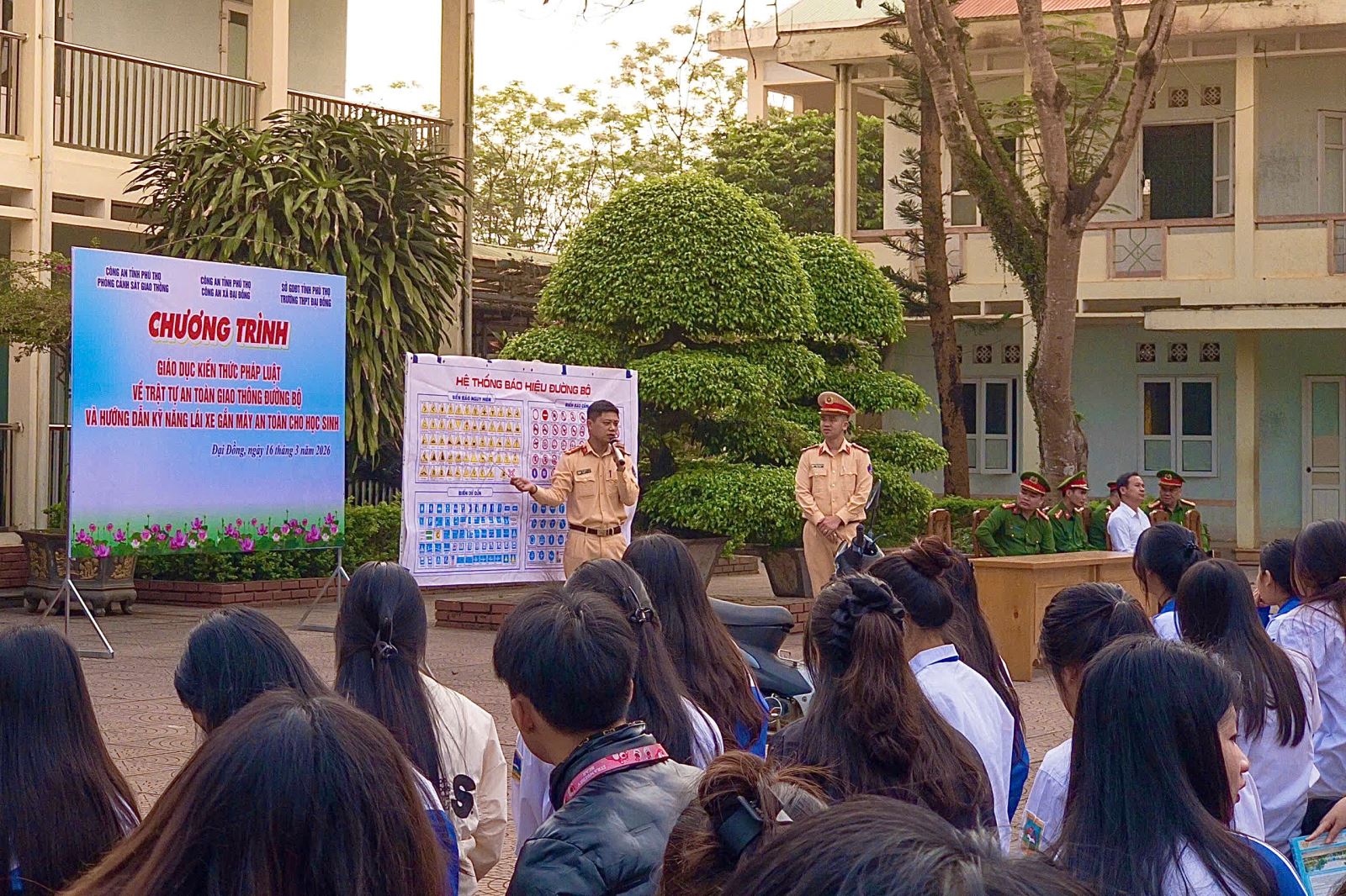 Trong thời gian gần đây, tình hình vi phạm giao thông liên quan đến thanh thiếu niên có xu hướng gia tăng, đặc biệt là ở lứa tuổi học sinh trung học phổ thông. Nhằm nâng cao nhận thức và ý thức chấp hành pháp luật cho học sinh, ngày 16/3/2026, Công an xã Đại Đồng đã phối hợp với Phòng Cảnh sát giao thông tổ chức buổi tuyên truyền pháp luật về trật tự an toàn giao thông và hướng dẫn kỹ năng lái xe an toàn cho trên 900 học sinh Trường THPT Đại Đồng. Hoạt động này không chỉ góp phần trang bị kiến thức pháp luật mà còn giúp các em hình thành thói quen tham gia giao thông văn minh, an toàn.