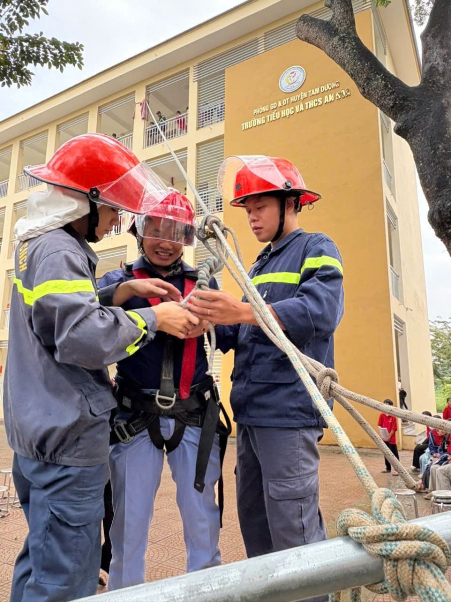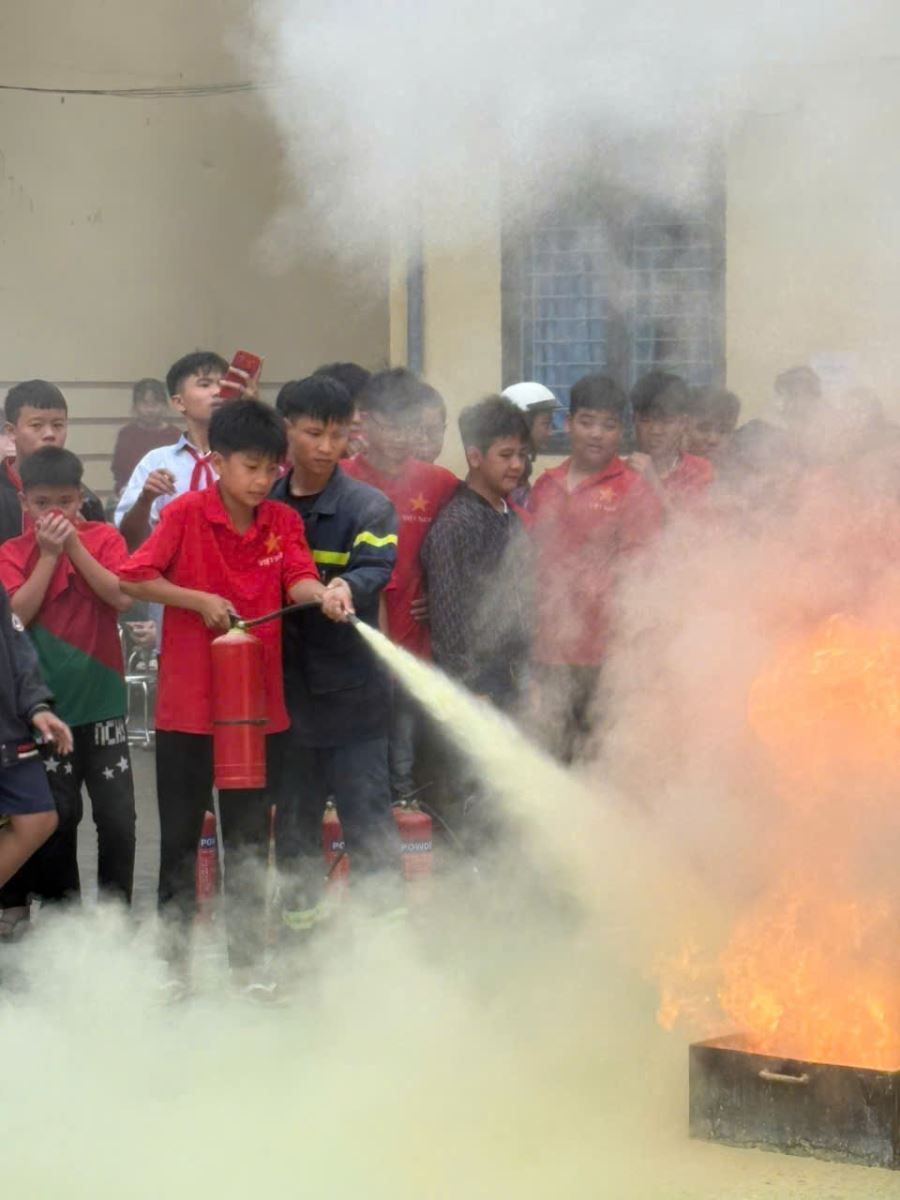 Sau phần lý thuyết, chương trình tiếp tục với phần thực hành sinh động, trong đó cán bộ, giáo viên và học sinh hào hứng tham gia dập tắt đám cháy giả định bằng bình chữa cháy, thoát nạn bằng cầu dây nghiêng, phun nước chữa cháy và xử lý tình huống cháy mô phỏng thực tế. Qua trải nghiệm, các em học sinh được rèn luyện thao tác kỹ thuật, nắm vững kỹ năng, bình tĩnh, chủ động khi gặp sự cố cháy, nổ.