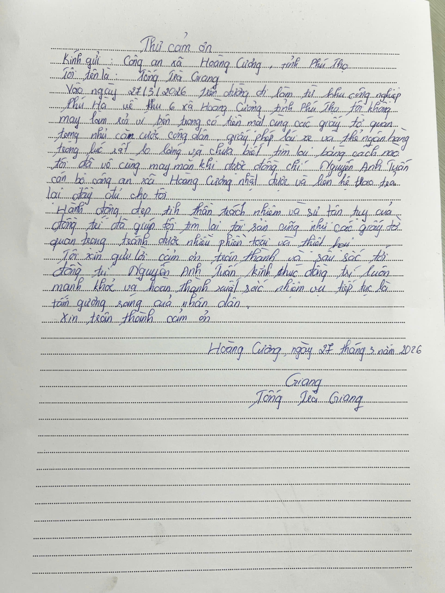 Thư cảm ơn của công dân gửi đến Công an xã Hoàng Cương