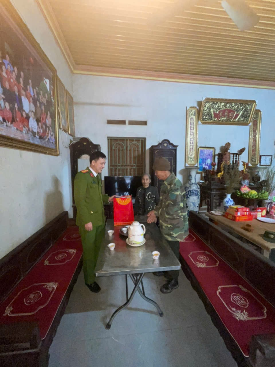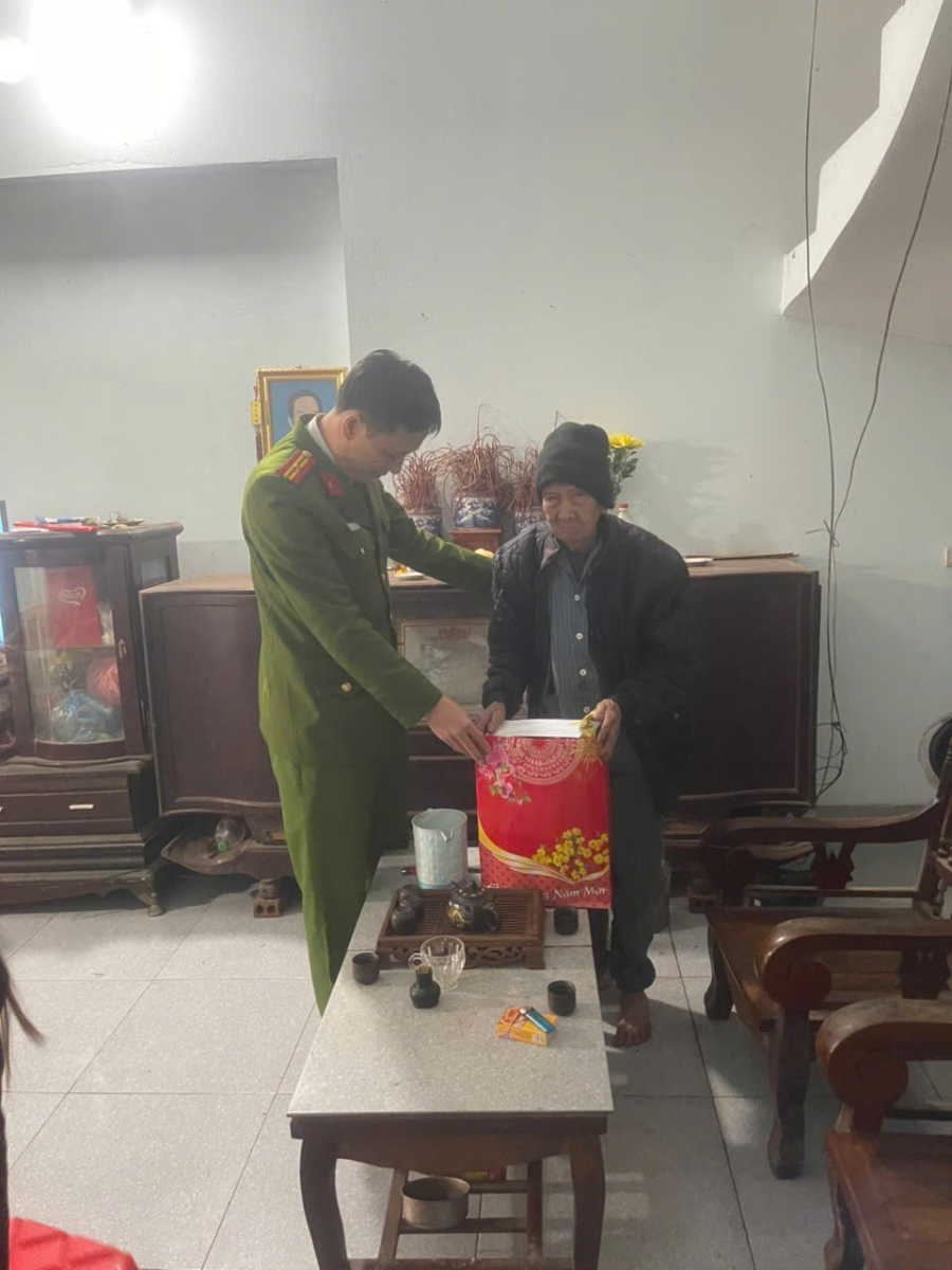 Hình ảnh hoạt động Tại các gia đình đến thăm, cán bộ, chiến sĩ Công an xã đã thăm hỏi tình hình sức khỏe, đời sống và điều kiện chuẩn bị đón Tết của bà con. Bên cạnh việc trao tặng những phần quà ý nghĩa, lực lượng Công an xã cũng kết hợp tuyên truyền, vận động nhân dân chấp hành nghiêm các quy định của pháp luật về an ninh trật tự, không tàng trữ, sử dụng pháo nổ trái phép và nâng cao cảnh giác với các loại tội phạm trong dịp Tết.