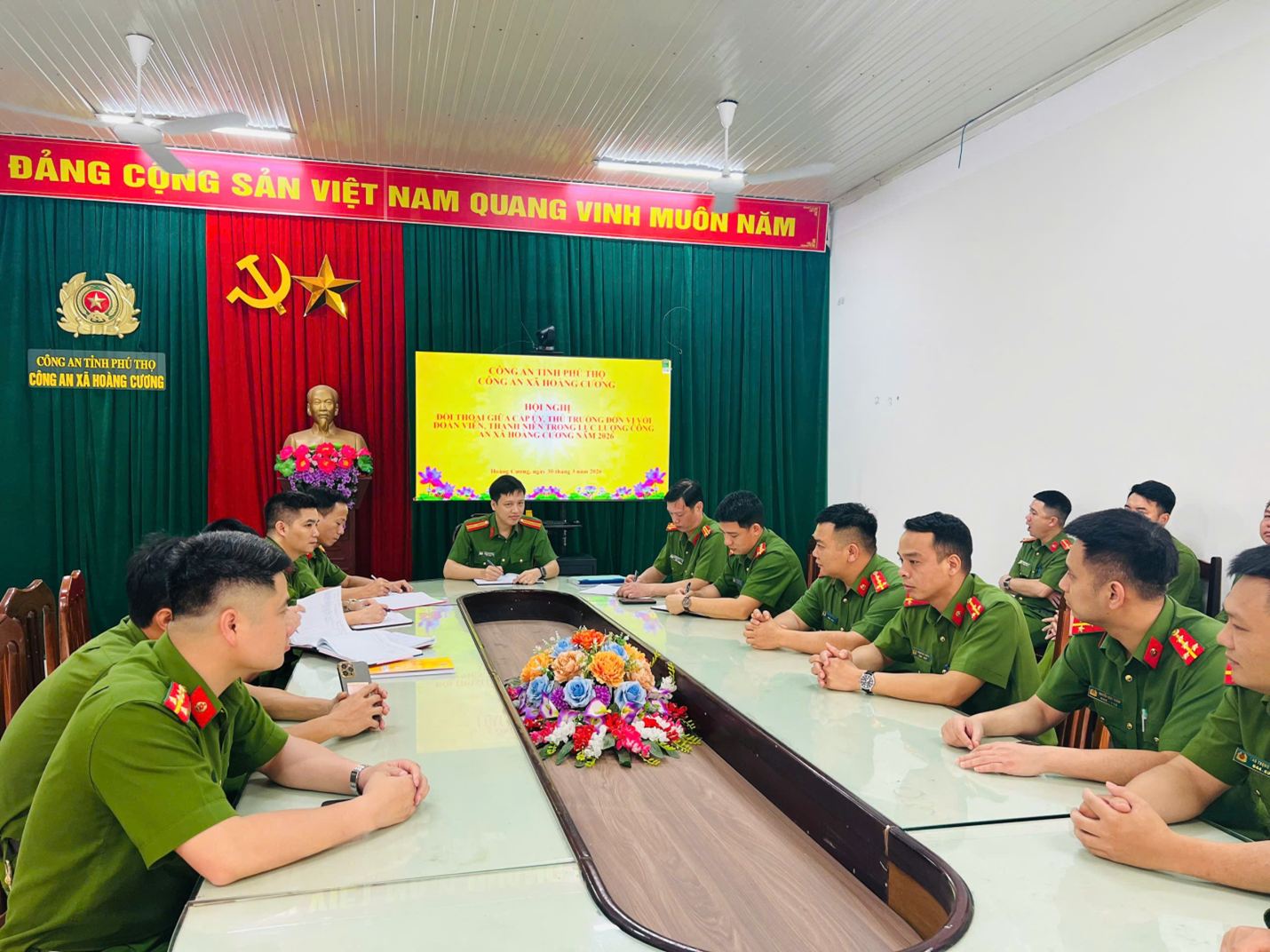 Thực hiện công tác xây dựng lực lượng và phát huy vai trò của đoàn viên, thanh niên trong thực hiện nhiệm vụ, sáng ngày 30/3/2026, Công an xã Hoàng Cương tổ chức Hội nghị đối thoại giữa cấp ủy, chỉ huy đơn vị với đoàn viên, thanh niên trong lực lượng.