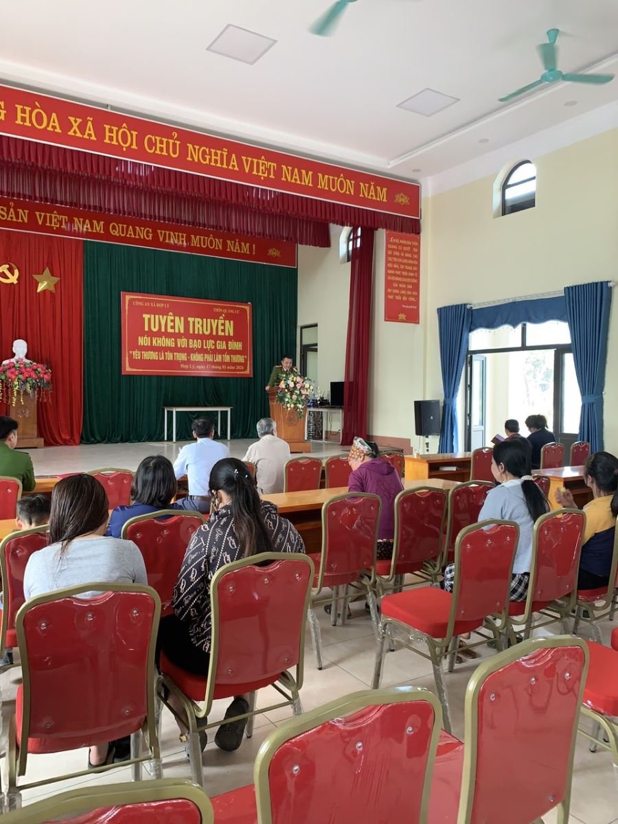 Hình ảnh tại buổi tuyên truyền Bên cạnh đó, báo cáo viên cũng đã đưa ra một số vụ việc điển hình đã xảy ra trên địa bàn tỉnh Phú Thọ và một số địa phương khác trong cả nước để phân tích rõ nguyên nhân, hậu quả của bạo lực gia đình. Qua đó, giúp người dân nhận thức đầy đủ hơn về những tổn hại lâu dài mà bạo lực gia đình gây ra, không chỉ đối với nạn nhân là phụ nữ, trẻ em mà còn ảnh hưởng trực tiếp đến hạnh phúc gia đình, sự phát triển nhân cách của thế hệ trẻ và tình hình an ninh, trật tự tại địa phương.
