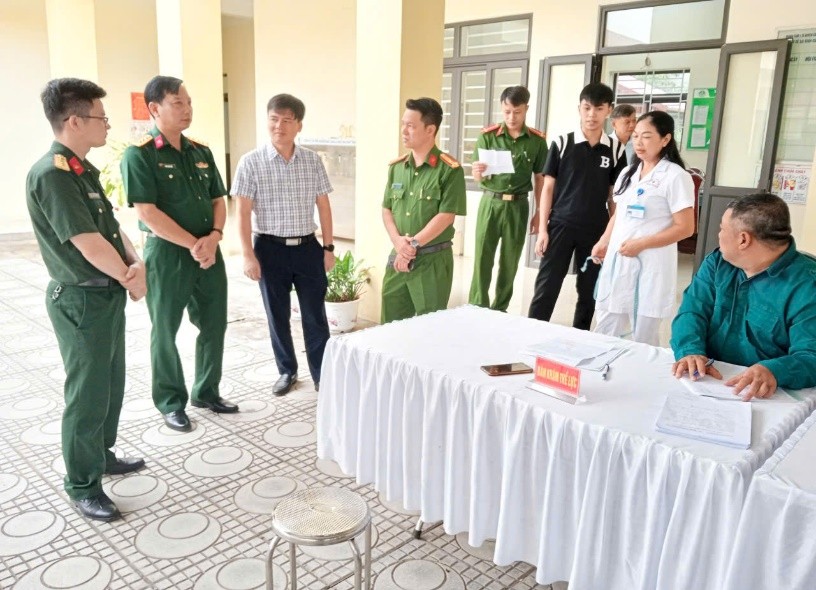 Hình ảnh lực lượng Công an xã bảo đảm an ninh trật tự, phối hợp khám sơ tuyển nghĩa vụ quân sự và nghĩa vụ tham gia