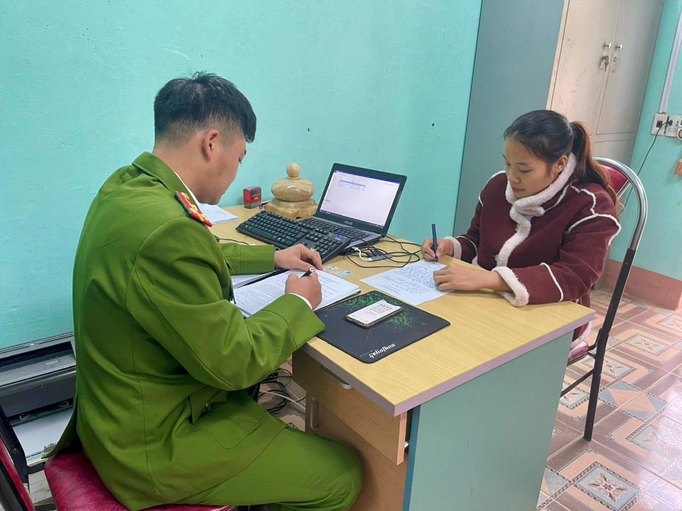 Công an xã Khả Cửu tiếp nhận trình báo của chị Hà Thị Sáng