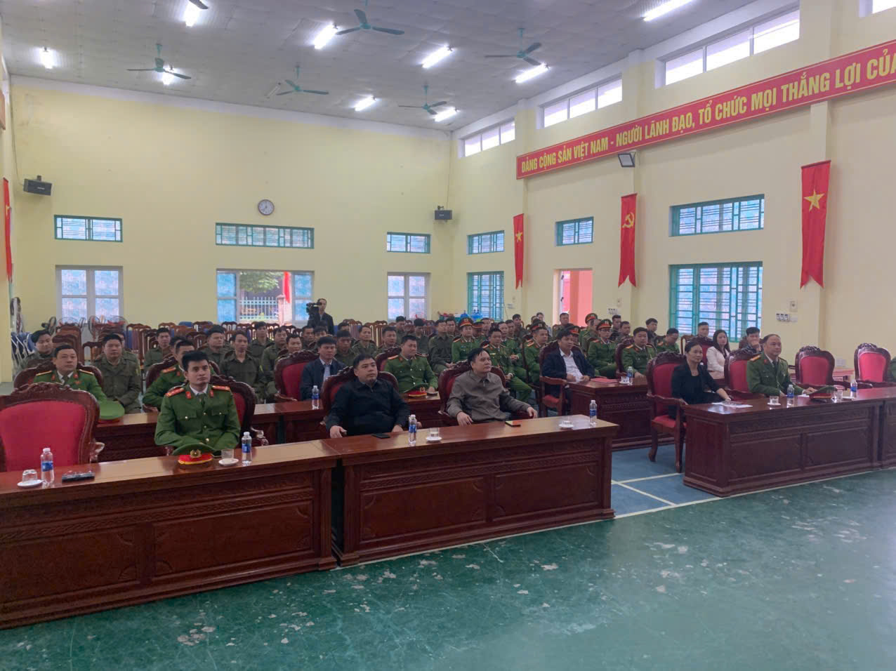 Toàn cảnh hội nghị lễ ra quân Đồng chí Trung tá Bùi Văn Tuần - Phó Bí thư Đảng uỷ, Phó Trưởng Công an xã đã triển khai Kế hoạch mở đợt cao điểm tấn công, trấn áp tội phạm, bảo đảm an ninh, trật tự đại hội đại biểu toàn quốc lần thứ XIV của Đảng, bầu cử đại biểu quốc hội khoá XVI, hội đồng nhân dân các cấp nhiệm kỳ 2026 - 2031; Tết Nguyên đán Bính Ngọ 2026, các sự kiện lớn của đất nước và các lễ hội đầu năm. Đồng thời phát động phong trào thi đua “Ba nhất”: Kỷ luật nhất - Trung thành nhất - Gần dân nhất” nhằm tạo động lực chính trị - tinh thần mạnh mẽ để cán bộ, chiến sĩ Công an quyết tâm thực hiện thắng lợi Nghị quyết Đại hội Đảng các cấp, trực tiếp là Đại hội Đảng bộ Công an tỉnh Phú Thọ lần thứ I, Nghị quyết Đại hội Đảng bộ Công an tỉnh, góp phần xây dựng lực lượng CAND thật sự trong sạch, vững mạnh, chính quy, tinh nhuệ, hiện đại, đáp ứng yêu cầu, nhiệm vụ bảo vệ an ninh, trật tự trong kỷ nguyên mới, kỷ nguyên phát triển dân tộc. Giáo dục, nâng cao nhận thức chính trị, rèn luyện bản lĩnh, ý chí chiến đấu, lòng trung thành, ý thức tổ chức kỷ luật, thường xuyên sâu sát với cơ sở, gắn bó mật thiết, củng cố mối quan hệ “máu thịt” với Nhân dân, xác định đây là nghĩa vụ thiêng liêng, là danh dự cao quý của Người chiến sĩ CAND trước Đảng và Nhân dân để xây dựng, củng cố vững chắc nền an ninh nhân dân.