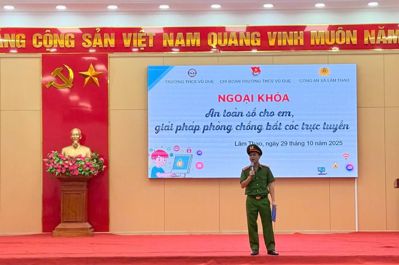 Hoạt động được tổ chức sáng ngày 29/10 và 03/11/2025 tại Trường THCS Vũ Duệ và Trường THPT Long Châu Sa, với sự phối hợp giữa Công an xã Lâm Thao, Đoàn Thanh niên xã và các nhà trường. Chương trình nhằm trang bị cho học sinh kiến thức pháp luật, nhận diện thủ đoạn của tội phạm mạng và nâng cao cảnh giác khi sử dụng Internet, mạng xã hội.