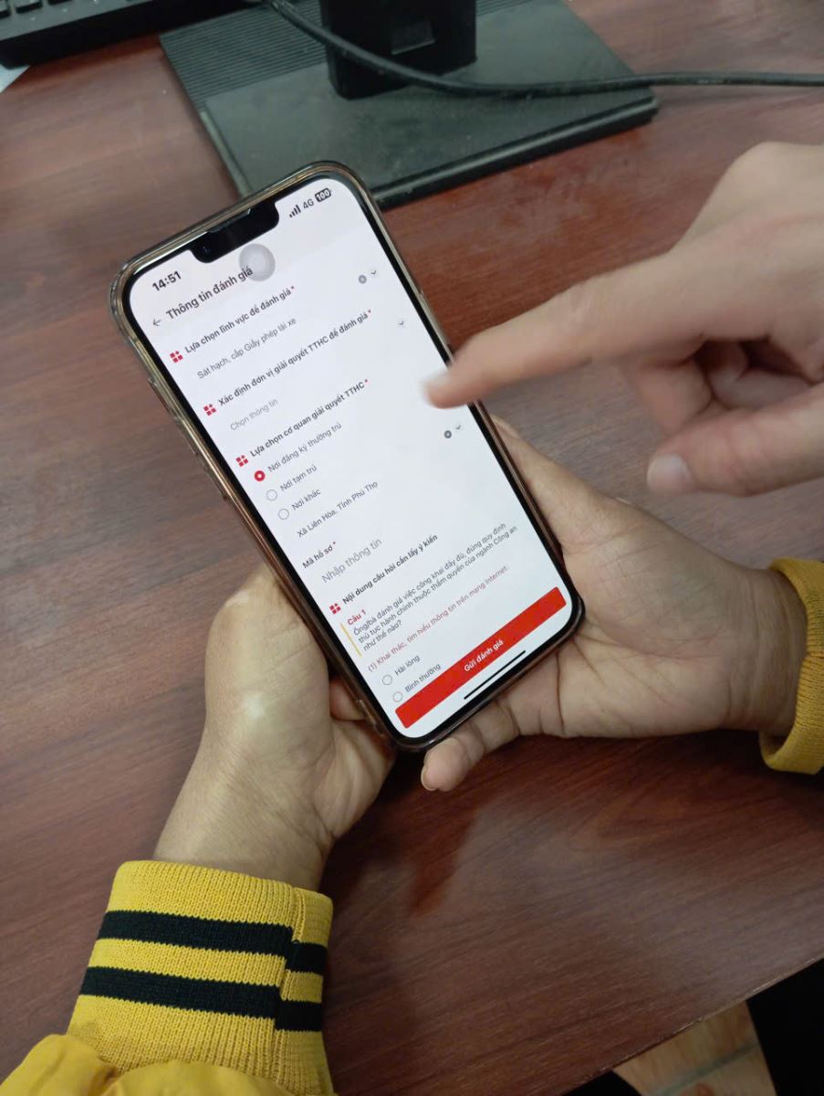 Tại Bộ phận một cửa của Công an xã, cán bộ trực thường xuyên hỗ trợ, hướng dẫn công dân đã thực hiện thủ tục hành chính trong lĩnh vực sát hạch, cấp GPLX đăng nhập vào ứng dụng VNeID trên điện thoại cá nhân để thực hiện đánh giá mức độ hài lòng đối với quá trình giải quyết thủ tục. Việc lấy ý kiến được thực hiện trực tiếp, nhanh gọn, giúp người dân dễ dàng phản hồi về thái độ phục vụ, thời gian giải quyết và kết quả nhận được.