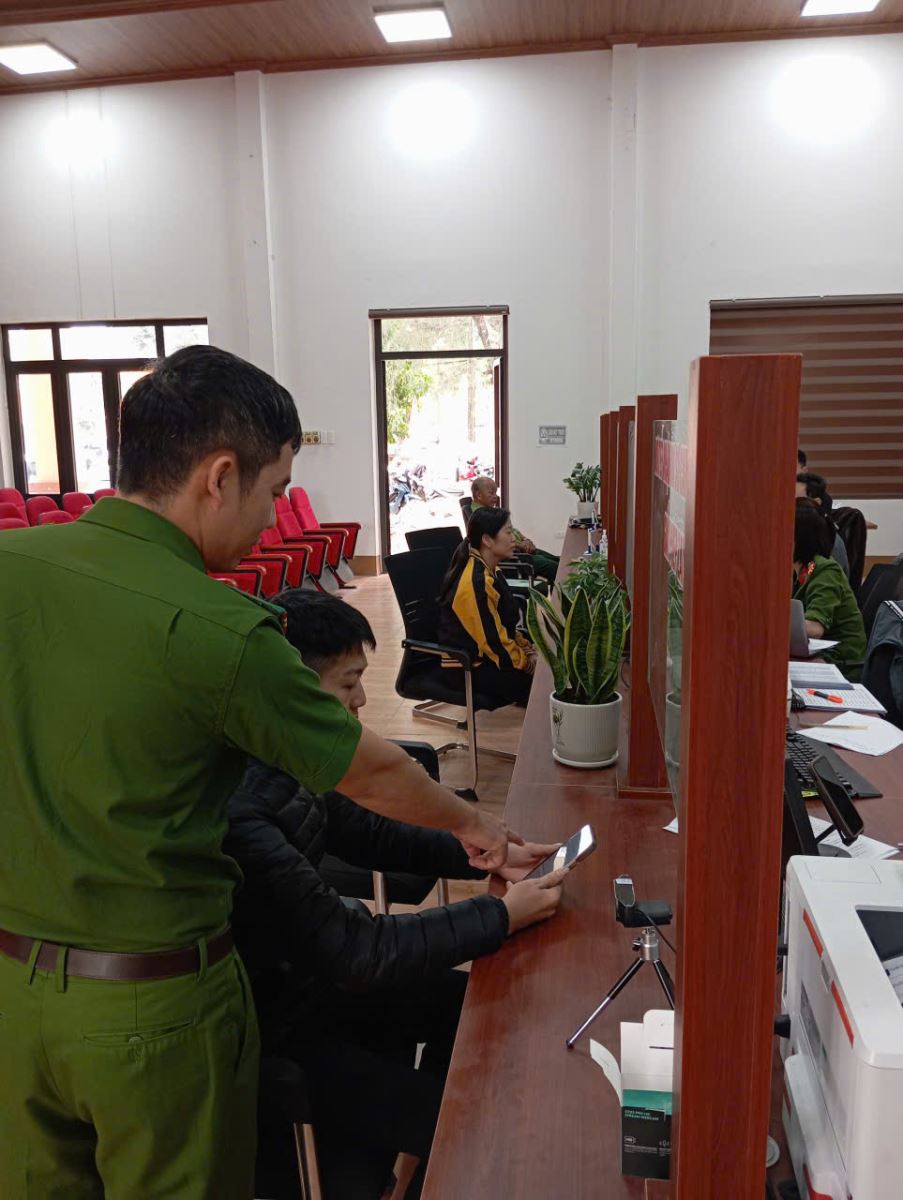 Hình ảnh cán bộ Công an xã hướng dẫn công dân sử dụng ứng dụng VNeID để thực hiện thủ tục hành chính