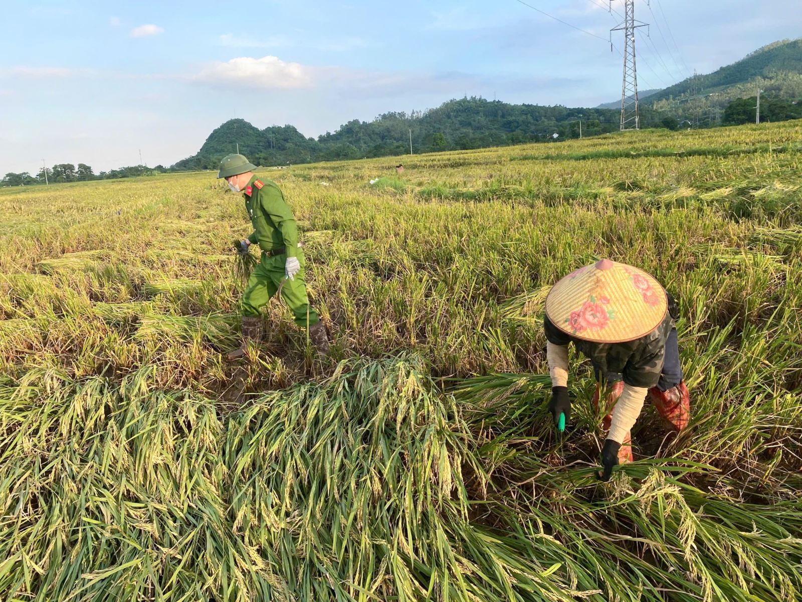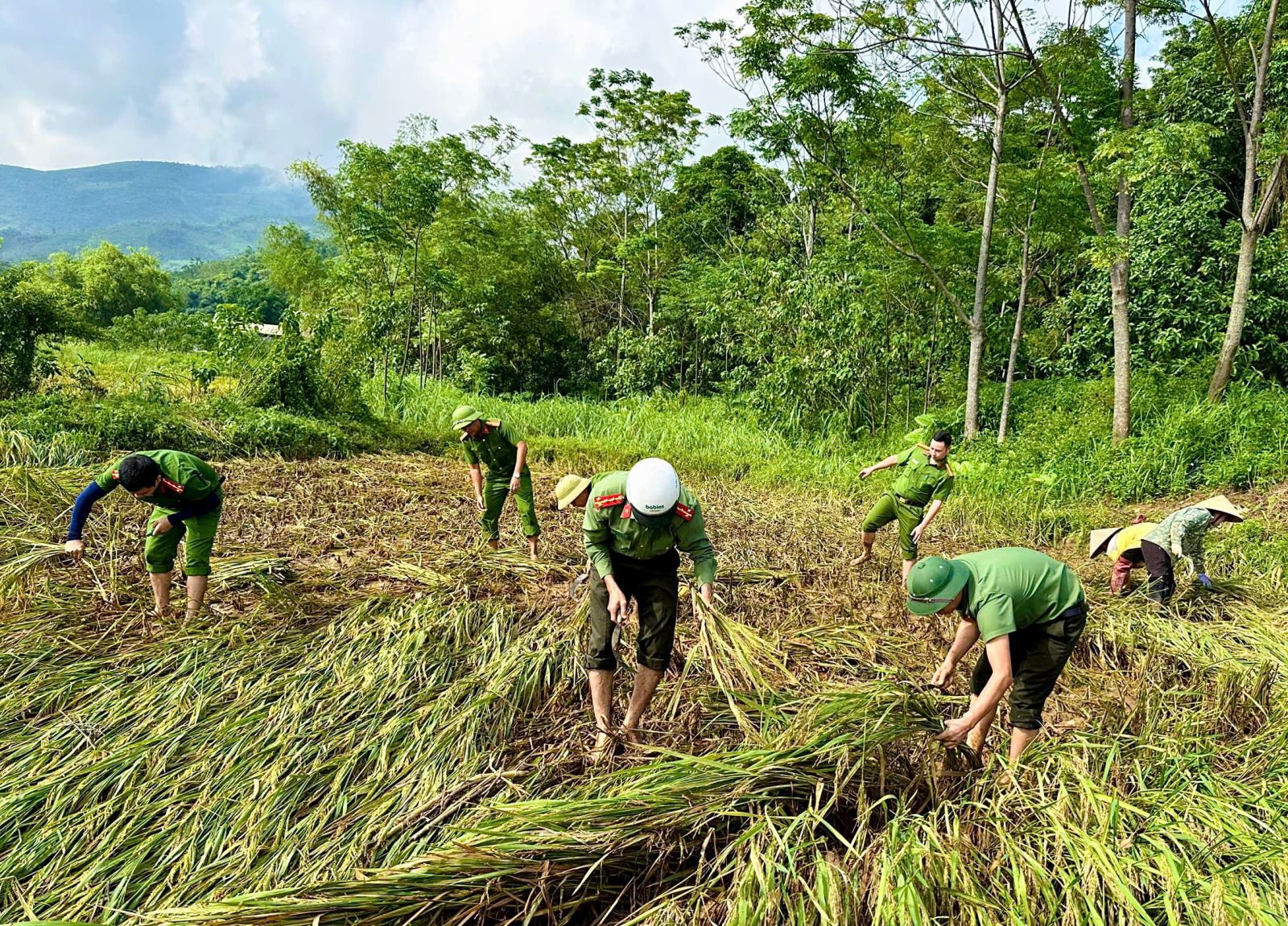 Hình ảnh cán bộ công an xã giúp người dân gặt lúa sau bão