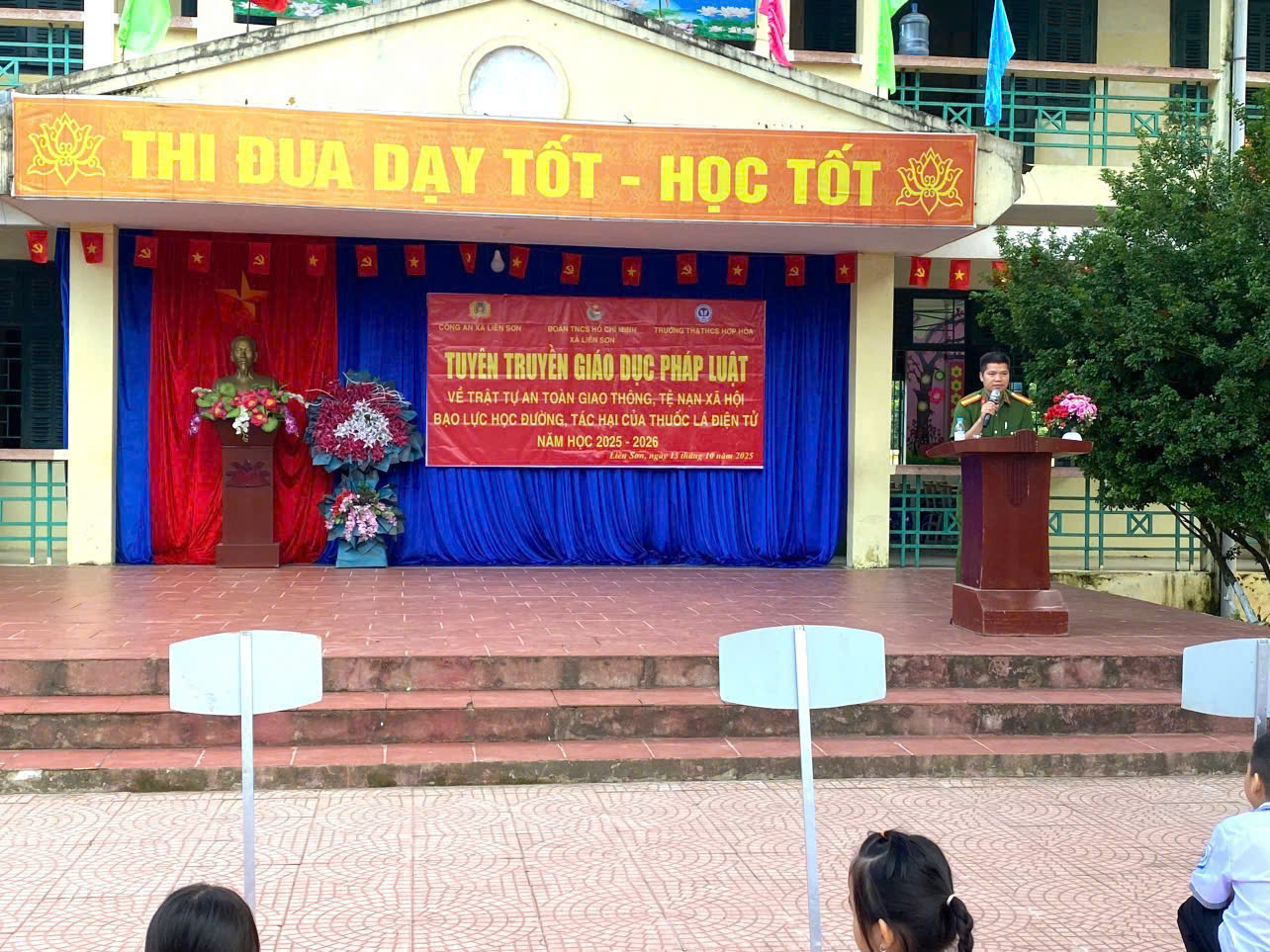 Trong các ngày 13/10/2025 và 21/10/2025, Công an xã Liên Sơn phối hợp với Trường Tiểu học và THCS Hợp Hòa và Trường Tiểu học và THCS Liên Sơn tổ chức các buổi tuyên truyền, giáo dục pháp luật về trật tự an toàn giao thông, phòng chống tệ nạn xã hội, phòng chống bạo lực học đường và tác hại của thuốc lá điện tử cho gần 1.000 cán bộ, giáo viên và học sinh của hai nhà trường.