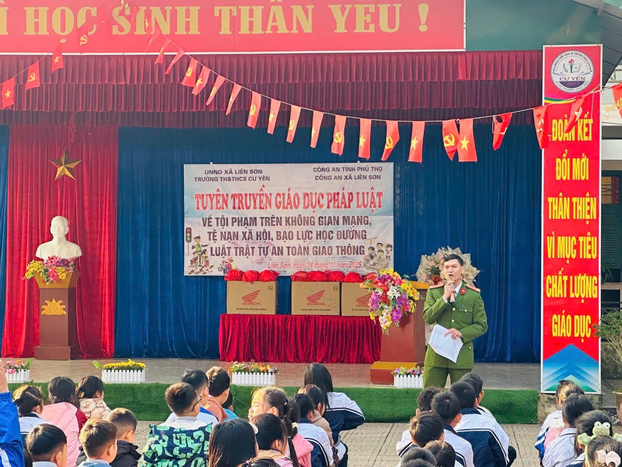 Ngày 24/11/2025, Công an xã Liên Sơn phối hợp với Trường Tiểu học và THCS Cư Yên tổ chức buổi tuyên truyền về an toàn học đường, an toàn trực tuyến và an toàn giao thông cho gần 900 học sinh. Đây là hoạt động thực hiện hướng dẫn của Công an tỉnh trong công tác phòng, chống tội phạm và triển khai Chiến dịch “Không một mình - Cùng nhau an toàn trực tuyến”.