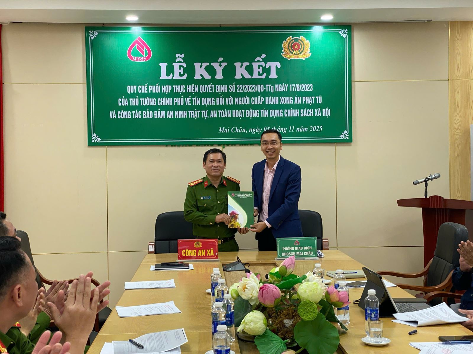 Theo Quyết định số 22/2023/QĐ-TTg, người chấp hành xong án phạt tù được vay vốn ưu đãi để sản xuất, kinh doanh, tạo việc làm, ổn định cuộc sống, tái hòa nhập cộng đồng. Để thực hiện hiệu quả chính sách này, công tác đảm bảo an ninh, an toàn tại các điểm giao dịch là yêu cầu quan trọng, cần có sự phối hợp chặt chẽ giữa lực lượng Công an và NHCSXH.Để triển khai hiệu quả chính sách, công tác bảo đảm an ninh, an toàn tại các điểm giao dịch tín dụng được xác định là yếu tố then chốt. Trên cơ sở hướng dẫn của Bộ Công an, NHCSXH Việt Nam và Công an tỉnh Phú Thọ, Công an xã Mai Châu và Phòng giao dịch NHCSXH Mai Châu đã thống nhất ban hành Quy chế phối hợp, quy định rõ trách nhiệm, chế độ thông tin, cơ chế phối hợp trong công tác bảo vệ con người, tài sản, hồ sơ, chứng từ tại trụ sở và các điểm giao dịch trên địa bàn.