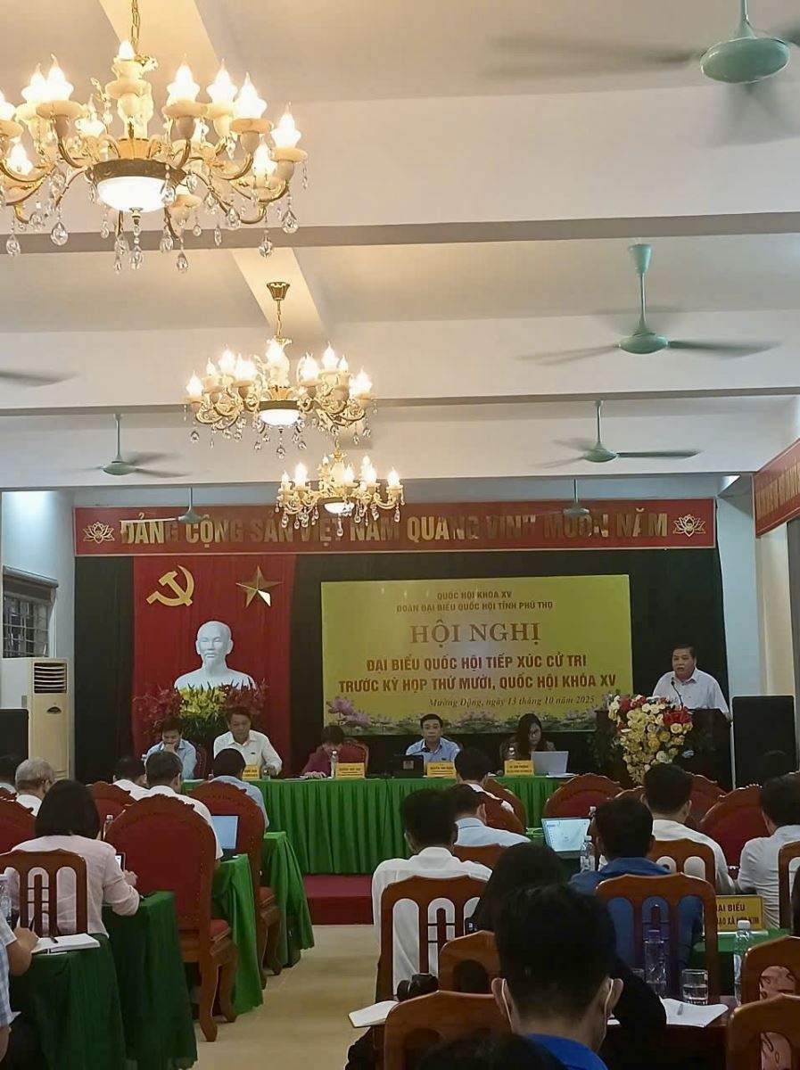 Chiều ngày 13/10/2025, tại trụ sở Đảng uỷ, UBND xã Mường Động, Đoàn Đại biểu Quốc hội tỉnh Phú Thọ tỉnh gồm các đồng chí: Nguyễn Thúy Anh - Ủy viên BCH Trung ương Đảng, Phó Trưởng Ban Chính sách, Chiến lược Trung ương; Nguyễn Thành Nam - Ủy viên Ủy ban Kinh tế, Tài chính của Quốc hội; Nguyễn Văn Mạnh - Tỉnh ủy viên, Phó Trưởng Đoàn ĐBQH tỉnh; Hoàng Đức Chính - Tỉnh ủy viên, Bí thư Đảng ủy xã Lạc Sơn; Hà Ánh Phượng - Giáo viên trường THPT Hương Cần đã có buổi tiếp xúc cử tri cụm xã: Mường Động, Nật Sơn, Kim Bôi, Dũng Tiến, Hợp Kim trước Kỳ họp thứ 10, Quốc hội khóa XV. Cùng dự có đồng chí Đinh Công Sứ - Tỉnh ủy viên, Phó Chủ tịch UBND tỉnh; lãnh đạo một số sở, ban, ngành tỉnh.