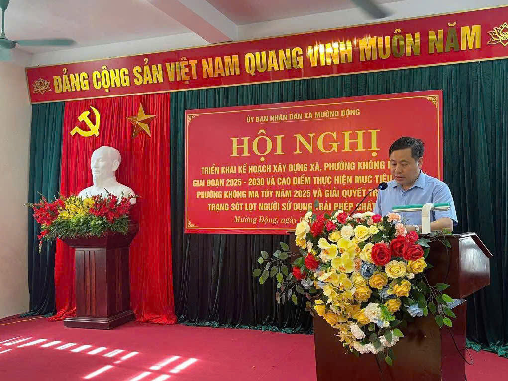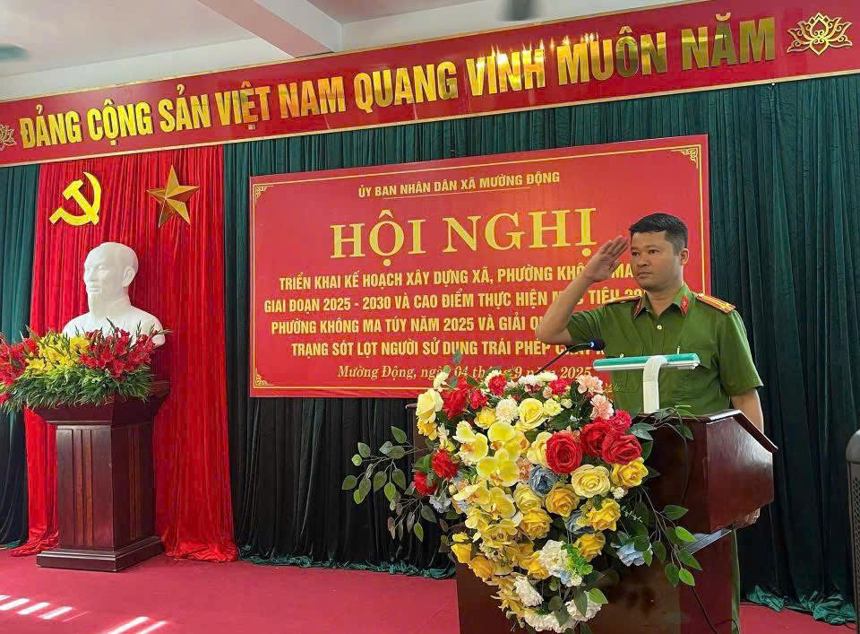 Sáng 04/9/2025, Công an xã Mường Động đã tham mưu UBND xã tổ chức Hội nghị triển khai kế hoạch xây dựng xã, phường không ma tuý giai đoạn 2025 – 2030; đồng thời phát động cao điểm thực hiện mục tiêu 20% xã, phường không ma tuý trong năm 2025 và giải quyết triệt để tình trạng sót, lọt người sử dụng trái phép chất ma tuý trên địa bàn.