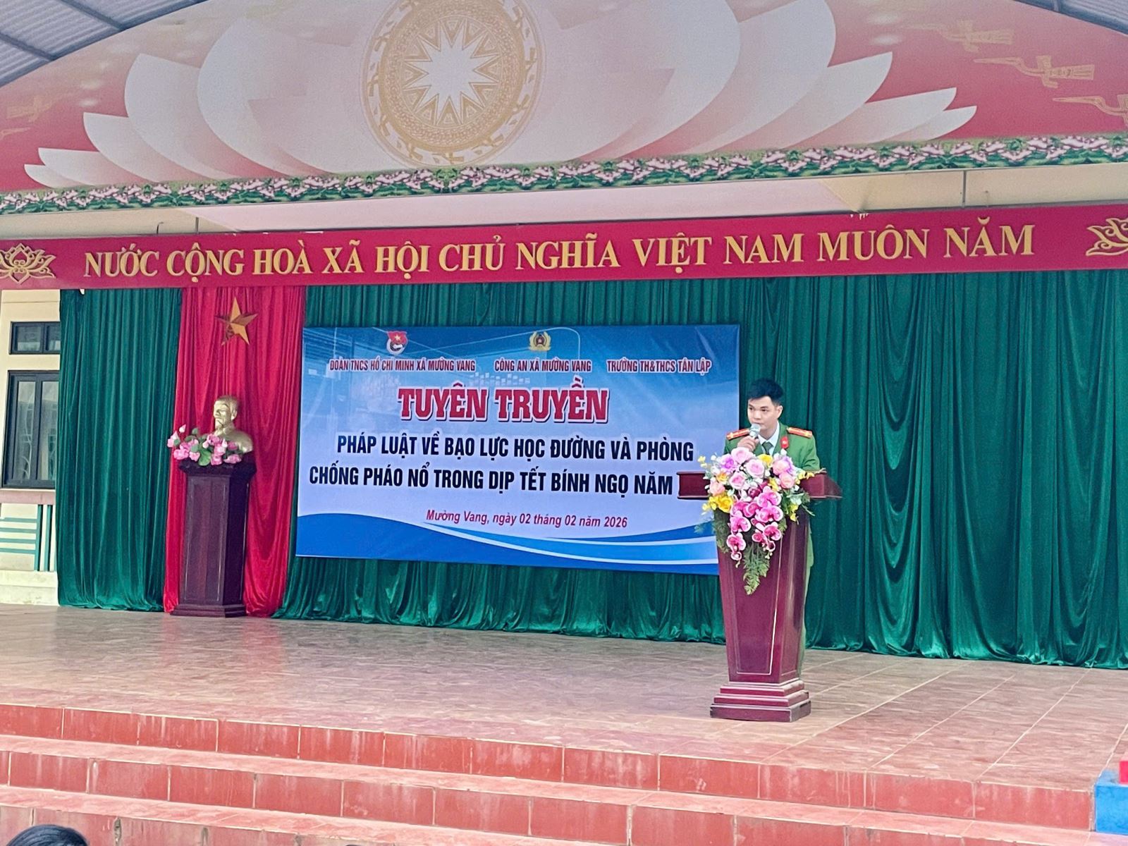 Trong bối cảnh các nền tảng mạng xã hội phát triển mạnh mẽ và dịp Tết Nguyên đán đang đến gần, công tác giáo dục pháp luật, phòng ngừa vi phạm cho thanh thiếu niên, học sinh ngày càng được đặt lên hàng đầu. Nhận thức rõ vai trò của công tác tuyên truyền, ngày 02/02/2026, Công an xã Mường Vang đã phối hợp với Ban Giám hiệu Trường Tiểu học và Trung học cơ sở Tân Lập tổ chức buổi tuyên truyền pháp luật về phòng, chống bạo lực học đường và ngăn chặn tình trạng sử dụng pháo nổ trong dịp Tết Nguyên đán Bính Ngọ 2026.