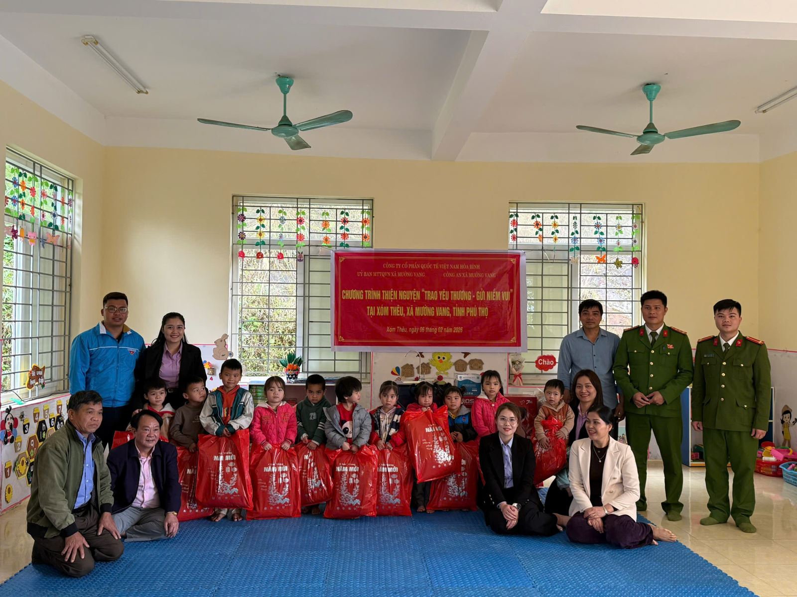 Sáng ngày 06/02/2026, Công an xã Mường Vang đã phối hợp với Công ty Cổ phần Quốc tế Việt Nam Hòa Bình tổ chức chương trình thiện nguyện “Trao yêu thương - Gửi niềm vui” tại Tại Chi điểm trường mầm non xóm Thêu, xã Mường Vang, tỉnh Phú Thọ.