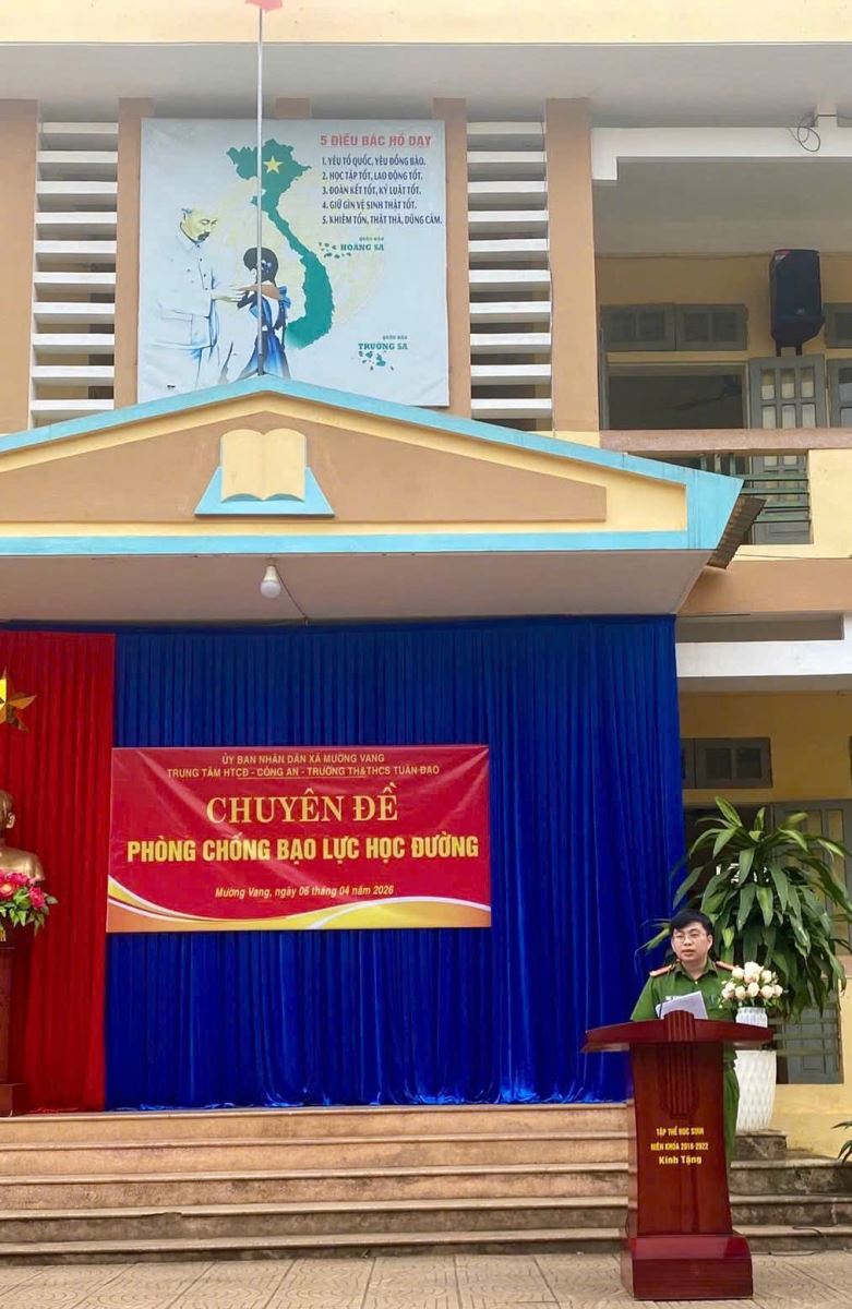 Sáng ngày 06/4/2026, Công an xã Mường Vang phối hợp với Trường Tiểu học và Trung học cơ sở Tuân Đạo tổ chức buổi tuyên truyền chuyên đề về phòng, chống bạo lực học đường cho toàn thể cán bộ, giáo viên và học sinh trên địa bàn.