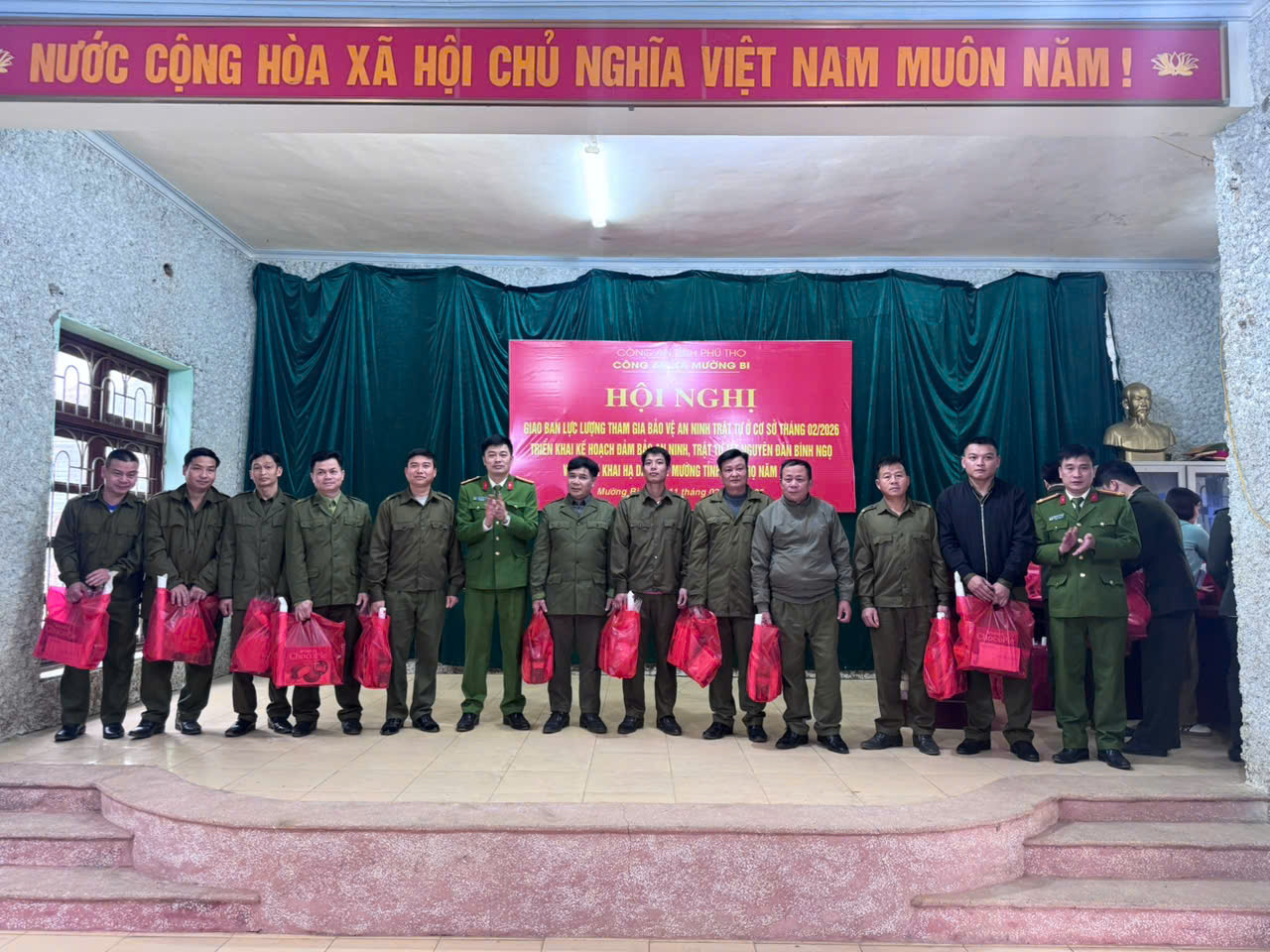 Công an xã trao quà tết chúc mừng động viên lực lượng Bảo vệ ANTT ở cơ sở Trên cơ sở đánh giá tình hình thực tế, hội nghị đã quán triệt các phương án, kế hoạch bảo đảm an ninh, trật tự trong dịp Tết Nguyên đán cổ truyền 2026 và Lễ hội Khai hạ Mường Bi, tập trung vào các nhiệm vụ trọng tâm như: Tăng cường công tác nắm tình hình từ sớm, từ xa, từ cơ sở; đẩy mạnh tuần tra, kiểm soát, nhất là vào ban đêm và tại các địa bàn trọng điểm; chủ động phòng ngừa, đấu tranh với các loại tội phạm và tệ nạn xã hội; bảo đảm trật tự an toàn giao thông, phòng cháy, chữa cháy tại khu vực tổ chức lễ hội và các nơi tập trung đông người.