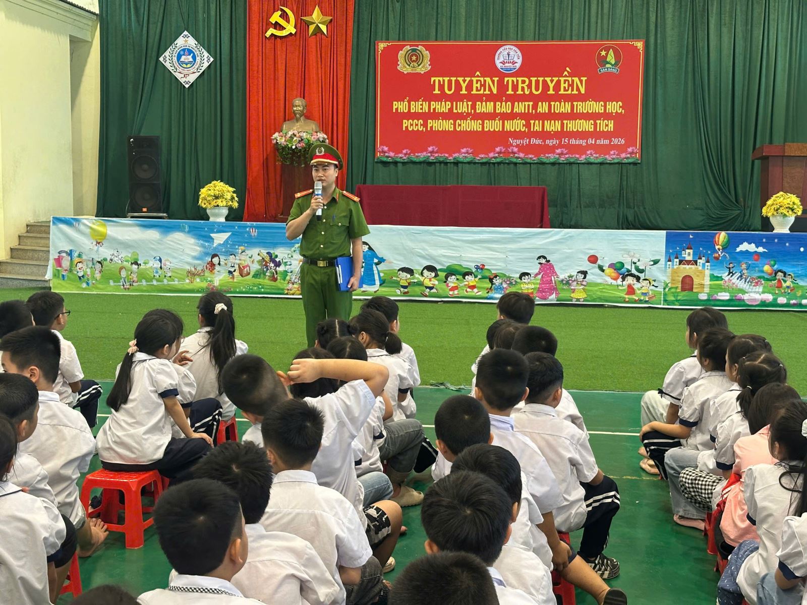 Nhằm tăng cường công tác tuyên truyền, trang bị kiến thức, kỹ năng phòng tránh tai nạn thương tích, phòng cháy chữa cháy, phòng tránh đuối nước trong dịp hè cho học sinh trên địa bàn xã, sáng 16/4/2026, Công an xã Nguyệt Đức phối hợp với Ban Giám hiệu Trường tiểu học Văn Tiến tổ chức buổi tuyên truyền, phổ biến kỹ năng phòng cháy chữa cháy, phòng chống đuối nước, tai nạn thương tích cho 615 học sinh và 36 giáo viên, công nhân viên nhà trường.