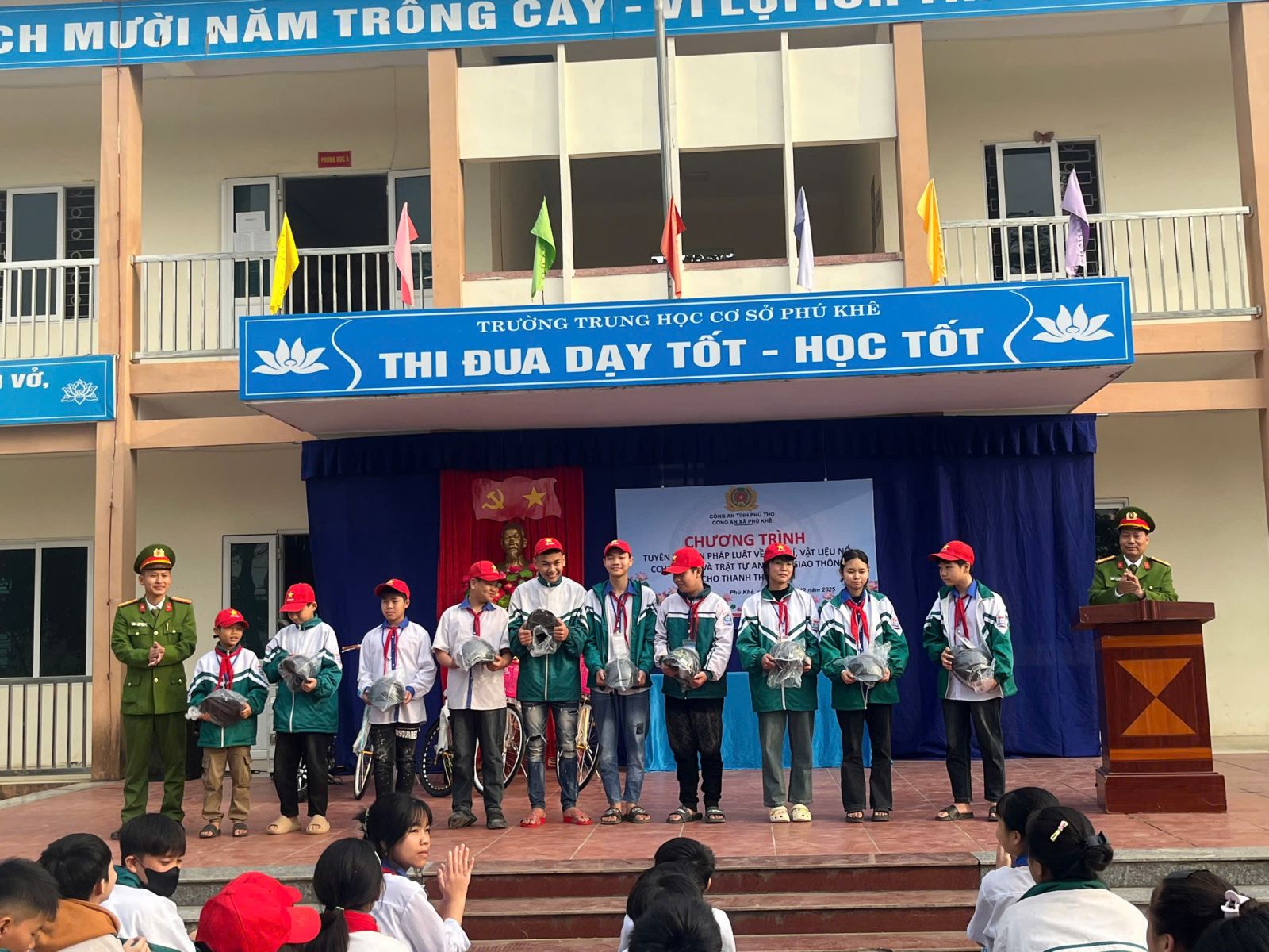 Nhân dịp này, Công an xã Phú Khê đã trao tặng 10 chiếc mũ bảo hiểm đạt chuẩn cho một số học sinh có hoàn cảnh khó khăn của nhà trường. Đây là hoạt động mang ý nghĩa thiết thực, góp phần khuyến khích học sinh hình thành thói quen đội mũ bảo hiểm khi tham gia giao thông bằng xe mô tô, xe gắn máy, xe đạp điện, qua đó giảm thiểu nguy cơ chấn thương khi xảy ra tai nạn.