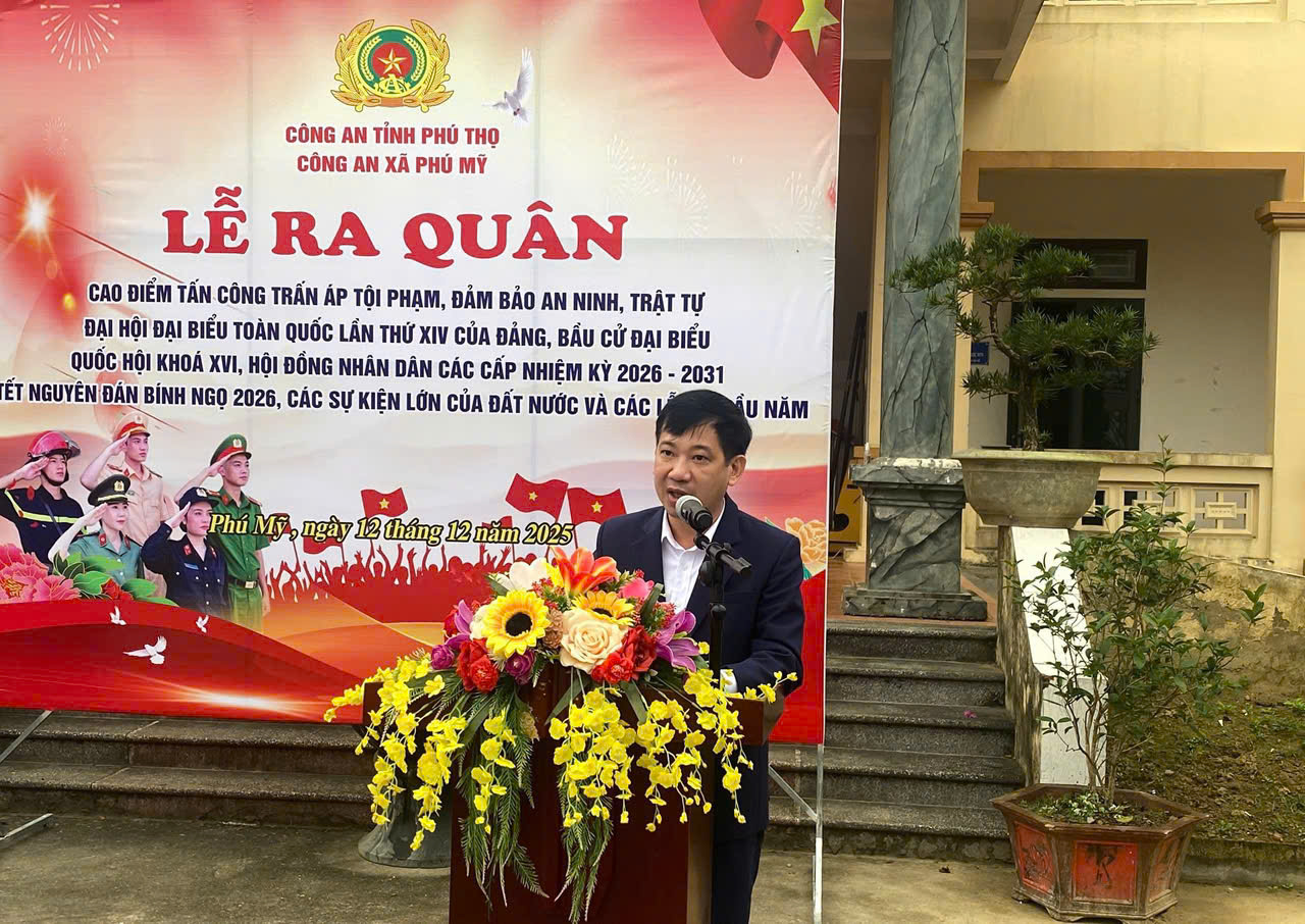 Đồng chí Nguyễn Đức Thanh - Phó Bí thư Đảng ủy, Chủ tịch UBND xã Phú Mỹ phát biểu tại buổi lễ Tại buổi lễ, thay mặt lãnh đạo địa phương, đồng chí Nguyễn Đức Thanh ghi nhận tinh thần trách nhiệm, sự nỗ lực của lực lượng Công an xã trong thời gian qua; đồng thời nhấn mạnh ý nghĩa đặc biệt quan trọng của đợt cao điểm lần này - thời điểm mà tình hình an ninh trật tự tiềm ẩn nhiều yếu tố phức tạp, đòi hỏi lực lượng Công an phải nâng cao tinh thần cảnh giác, chủ động tấn công, trấn áp các loại tội phạm, tệ nạn xã hội, kiên quyết không để bị động, bất ngờ. Đợt cao điểm được triển khai từ ngày 15/12/2025 đến hết ngày 16/3/2026, với các nhiệm vụ trọng tâm như: tăng cường tuần tra kiểm soát, xử lý nghiêm các hành vi vi phạm pháp luật; tập trung đấu tranh mạnh với tội phạm hình sự, ma túy, tín dụng đen; bảo đảm trật tự an toàn giao thông; phòng ngừa cháy nổ trong dịp Tết; giữ vững an ninh chính trị, trật tự an toàn xã hội trong mọi tình huống. Không khí buổi ra quân diễn ra trang nghiêm, thể hiện quyết tâm cao độ của lực lượng Công an xã Phú Mỹ trong việc giữ bình yên từng thôn xóm, bảo vệ cuộc sống bình an của Nhân dân, góp phần quan trọng vào thành công của các sự kiện chính trị trọng đại sắp tới.