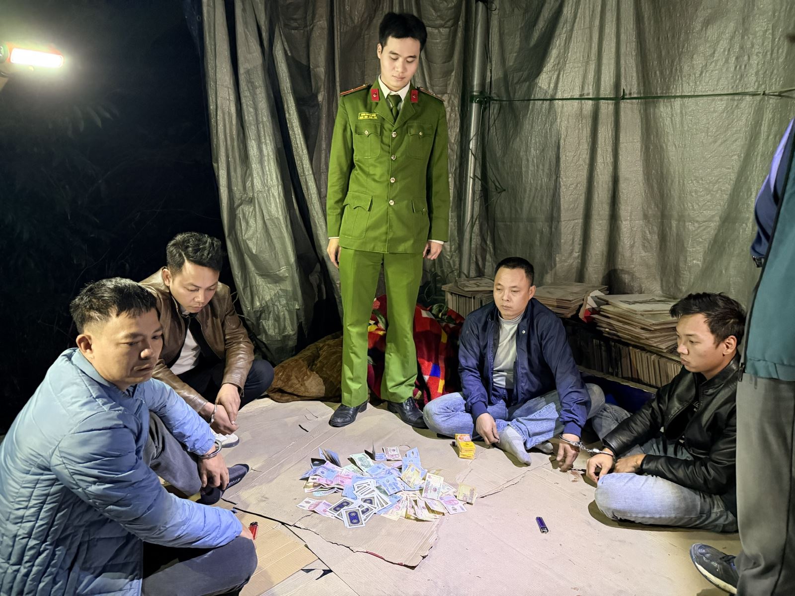 Tại thời điểm kiểm tra, lực lượng Công an phát hiện 7 đối tượng đang ngồi trên một chiếc giường kê tại khu vực kho, tổ chức đánh bạc dưới hình thức chơi bài “liêng” được thua bằng tiền. Các đối tượng gồm: Nguyễn Bá Hải, sinh năm 1987, đăng ký thường trú tại Khu 1, phường Vân Phú, tỉnh Phú Thọ; Nguyễn Trường Giang, sinh năm 1994, đăng ký thường trú tại Khu 20 (xã Bắc Sơn cũ), xã Hiền Quan, tỉnh Phú Thọ; Nguyễn Xuân Tuyến, sinh năm 1983, đăng ký thường trú tại Khu 7 (thị trấn Phong Châu cũ), xã Phù Ninh, tỉnh Phú Thọ; Đào Văn Thạch, sinh năm 1995, đăng ký thường trú tại Khu 9, phường Vân Phú, tỉnh Phú Thọ; Nguyễn Anh Tài, sinh năm 2004, đăng ký thường trú tại Khu 9 (xã Kim Đức cũ), phường Vân Phú, tỉnh Phú Thọ; Vũ Mạnh Trường, sinh năm 1976, đăng ký thường trú tại Khu 3 (xã Phú Lộc cũ), xã Phù Ninh, tỉnh Phú Thọ; và Phan Văn Hoàng, sinh năm 1994, đăng ký thường trú tại Đội 6 (xã Thụy Vân cũ), phường Nông Trang, tỉnh Phú Thọ.