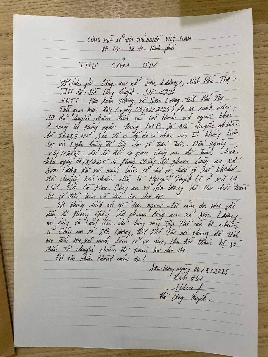 Ngày 6/8/2025, anh Hà Công Quyết (SN 1990, trụ tại khu Xuân Hương, xã Sơn Lương, tỉnh Phú Thọ) đã gửi thư cảm ơn, bày tỏ sự trân trọng trước tinh thần trách nhiệm và nỗ lực của Công an xã Sơn lương đã giúp anh Quyết lại lại số tiền chuyển nhầm hơn 50 triệu đồng.
