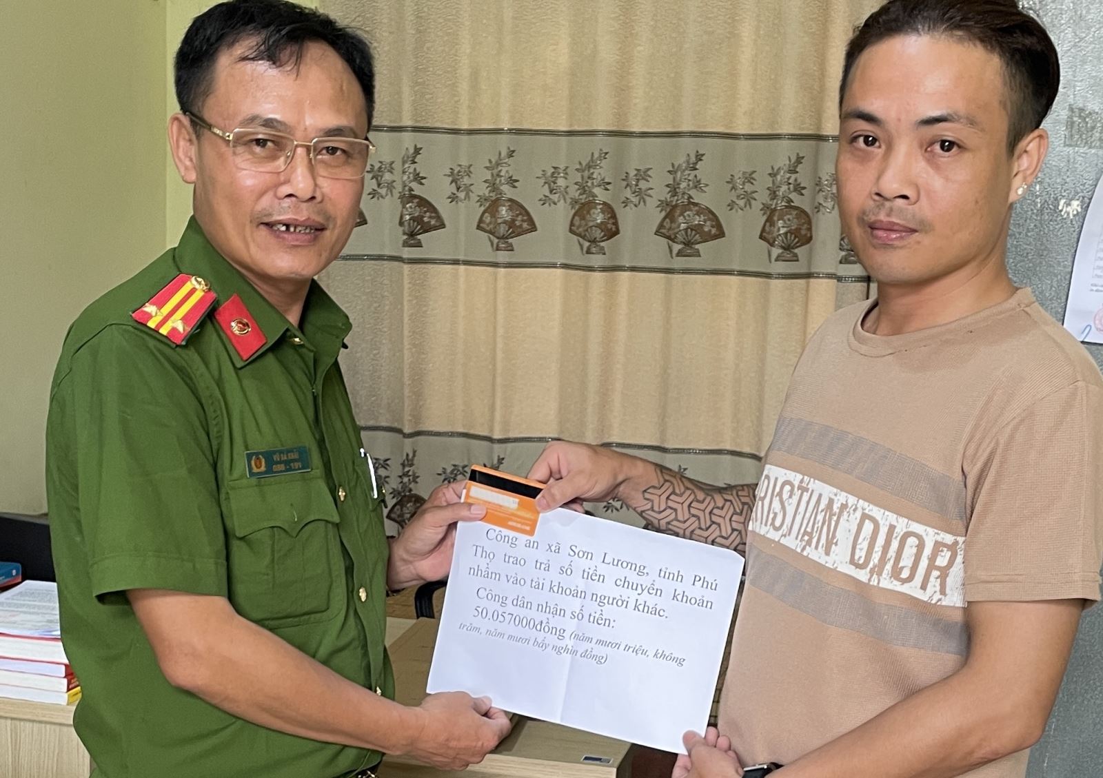 Trước đó, Ngày 6/7/2025, anh Hà Công Quyết (SN 1990, trú tại khu Xuân Hương, xã Sơn Lương, tỉnh Phú Thọ) đã đến Công an xã Sơn Lương trình báo về việc chuyển nhầm số tiền 50.057.000 đồng vào một tài khoản trong cùng hệ thống ngân hàng MB Bank. Tiếp nhận tin báo, Tổ Phòng chống tội phạm – Công an xã Sơn Lương nhanh chóng xác minh, làm rõ chủ tài khoản nhận số tiền trên là bà Nguyễn Tuyết Lệ, trú tại xã Nguyễn Phích, tỉnh Cà Mau. Công an xã Sơn Lương đã phối hợp với Công an xã Nguyễn Phích vận động bà Lệ hoàn trả lại toàn bộ số tiền cho anh Quyết.