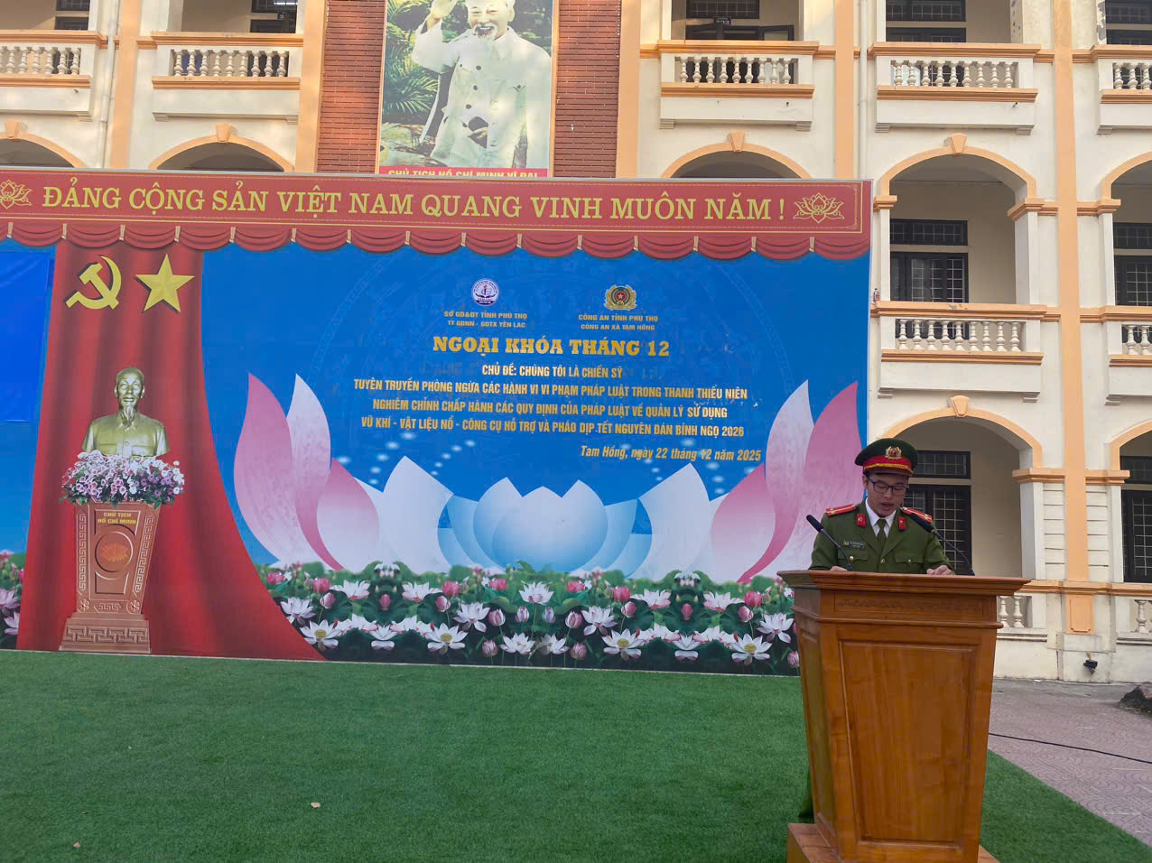 Nhằm nâng cao nhận thức pháp luật cho thanh thiếu niên, đặc biệt trong dịp trước, trong và sau Tết Nguyên đán Bính Ngọ 2026, Công an xã Tam Hồng đã phối hợp với Trung tâm Giáo dục thường xuyên Yên Lạc tổ chức buổi sinh hoạt ngoại khóa tuyên truyền, phổ biến pháp luật cho học sinh nhà trường, tập trung vào phòng ngừa vi phạm pháp luật và chấp hành nghiêm các quy định về quản lý, sử dụng vũ khí, vật liệu nổ, công cụ hỗ trợ và pháo.