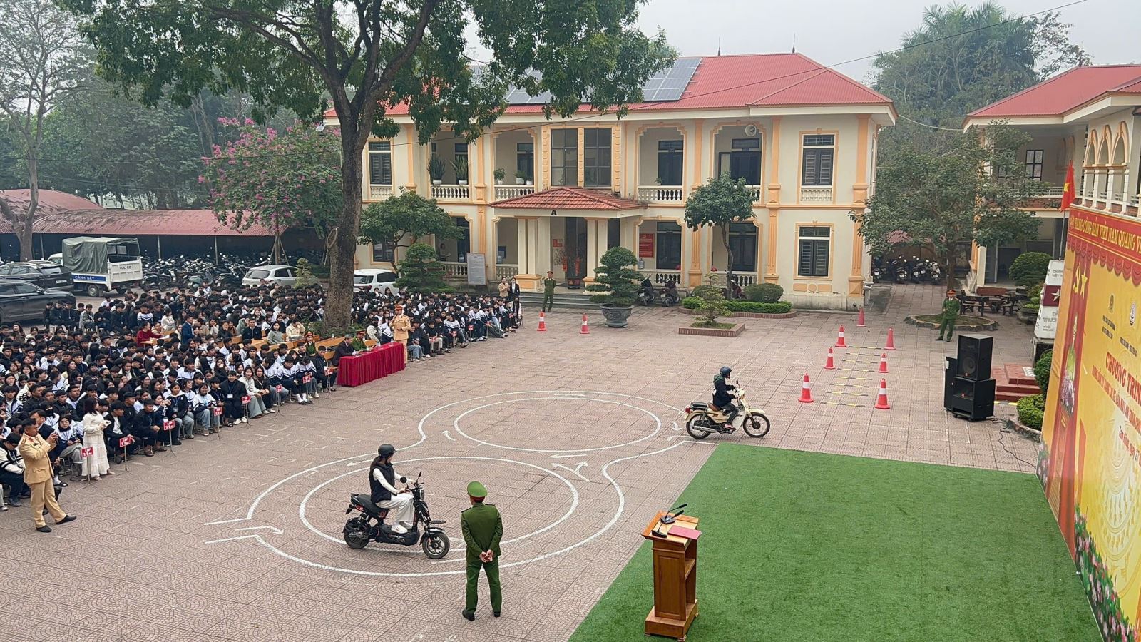 Tại buổi tuyên truyền, cán bộ lực lượng Cảnh sát giao thông đã phổ biến những quy định cơ bản của pháp luật về trật tự an toàn giao thông đường bộ liên quan trực tiếp đến lứa tuổi học sinh, đặc biệt là quy định về độ tuổi điều khiển phương tiện, điều kiện tham gia giao thông, trách nhiệm của người điều khiển xe mô tô, xe gắn máy và xe đạp điện. Đồng thời, phân tích rõ các lỗi vi phạm phổ biến thường xảy ra ở học sinh như: không đội mũ bảo hiểm khi ngồi trên mô tô, xe gắn máy, xe đạp điện; đi hàng hai, hàng ba; vượt đèn tín hiệu giao thông; tụ tập trước cổng trường gây mất trật tự, an toàn giao thông.