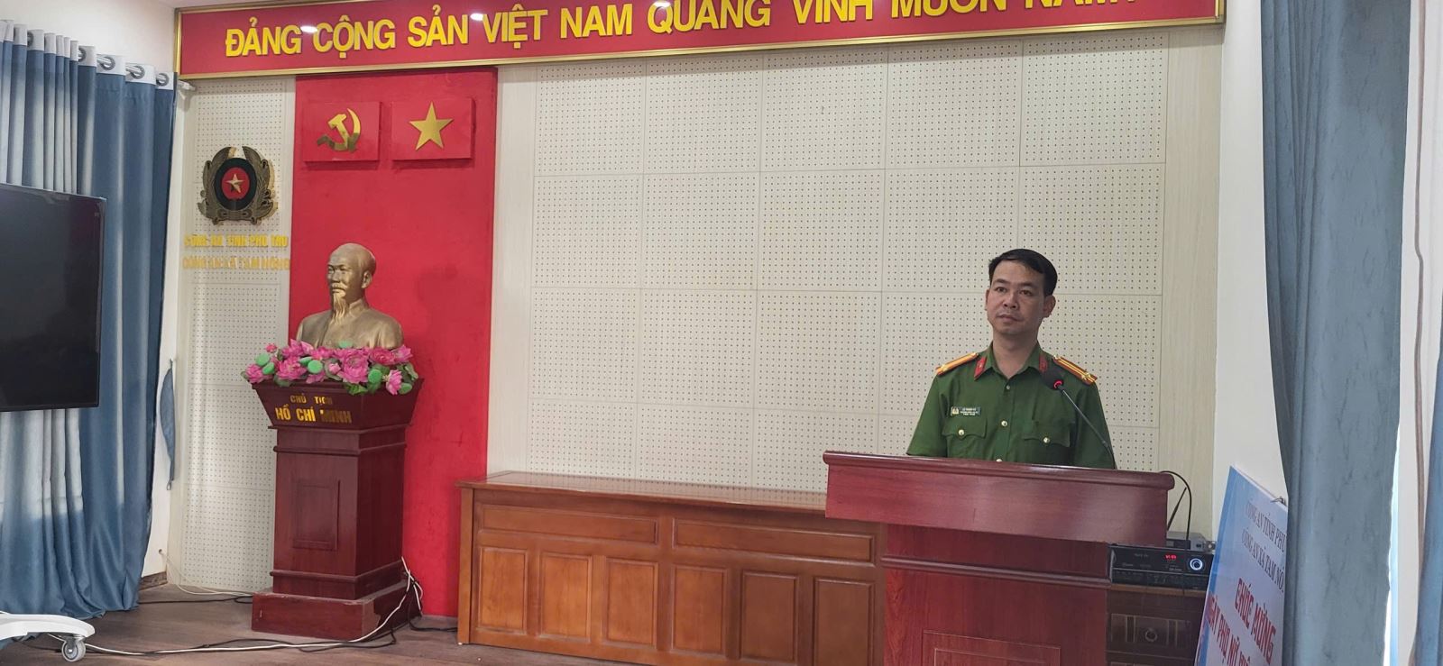 Đồng chí Trung tá Lê Thanh Hà- Phó Trưởng Công an xã phổ biến, quán triệt nội dung triển khai tại Hội Nghị