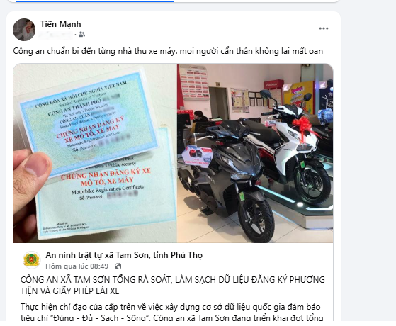Hình ảnh thông tin sai sự thật Nhìn chung, đại bộ phận quần chúng nhân dân đều đánh giá cao cách làm của Công an xã, tích cực chia sẻ thông tin chính thống. Tuy nhiên, qua công tác nắm tình hình trên không gian mạng, ngày 27/10/2025, Công an xã Tam Sơn phát hiện anh H.T.M, trú tại thôn Trung Sơn, xã Tam Sơn, tỉnh Phú Thọ, đã sử dụng facebook cá nhân của mình chia sẻ lại bài viết từ trang “An ninh trật tự xã Tam Sơn, tỉnh Phú Thọ” có nội dung liên quan đến việc lực lượng Công an triển khai rà soát, làm sạch dữ liệu đăng ký phương tiện và giấy phép lái xe kèm lời bình sai sự thật:“Công an chuẩn bị đến nhà thu xe máy. Mọi người cẩn thận không lại mất oan”.