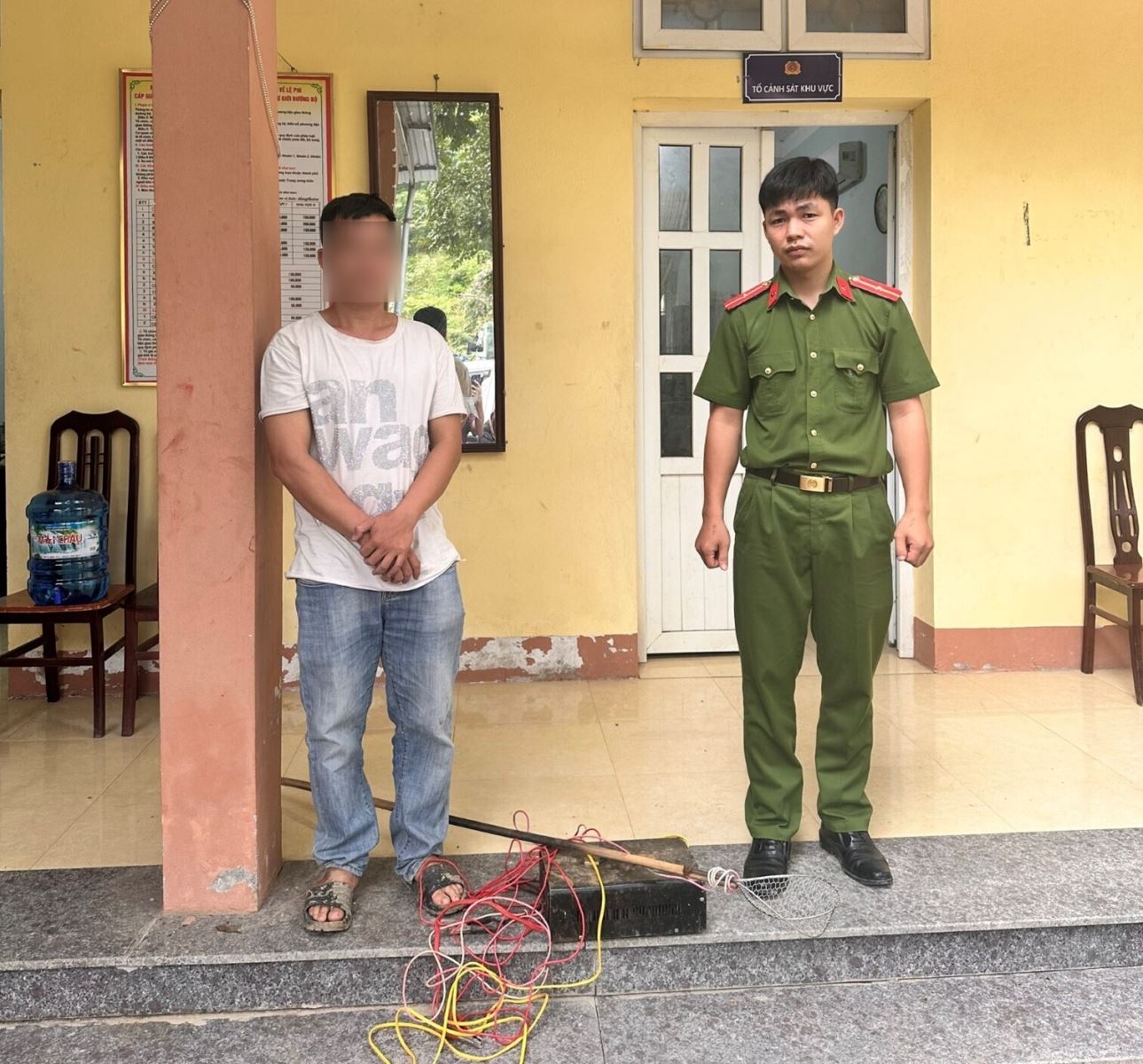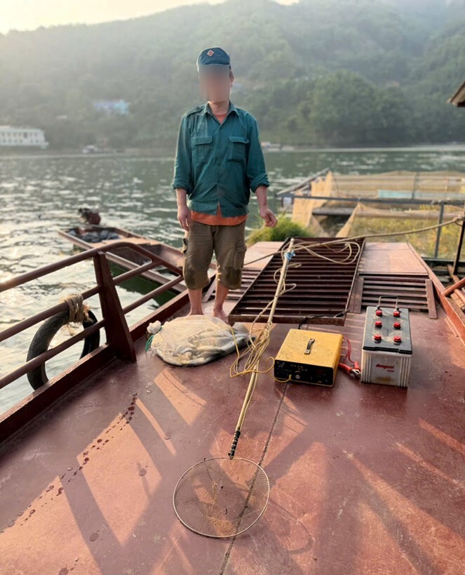 Tiếp đó, vào khoảng 10 giờ ngày 21/01/2026, trong quá trình tuần tra bảo vệ nguồn lợi thủy sản tại khu vực lòng hồ Sông Đà thuộc địa phận xóm Tân Thủy, xã Tân Mai, tổ công tác Công an xã phát hiện N.V.Đ, sinh năm 1980, trú tại xóm Bích Trụ, phường Tân Hòa, tỉnh Phú Thọ (hiện tạm trú tại xóm Tân Thủy, xã Tân Mai) đang sử dụng thiết bị kích điện để đánh bắt cá trái phép. Khi bị phát hiện, đối tượng bỏ chạy nhằm thoát khỏi sự kiểm tra của lực lượng chức năng. Tổ công tác đã tổ chức truy đuổi và khống chế thành công đối tượng cùng toàn bộ tang vật vi phạm.