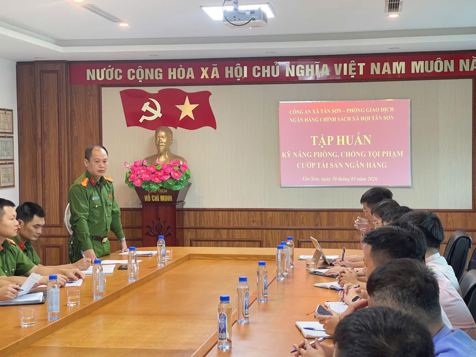 Trước nguy cơ tiềm ẩn của tội phạm cướp tài sản tại các điểm giao dịch ngân hàng, chiều ngày 30/3/2026, Công an xã Tân Sơn đã phối hợp với Phòng giao dịch Ngân hàng Chính sách xã hội Tân Sơn tổ chức tập huấn chuyên đề “Kỹ năng phòng, chống tội phạm cướp tài sản” cho cán bộ, nhân viên và lực lượng bảo vệ.