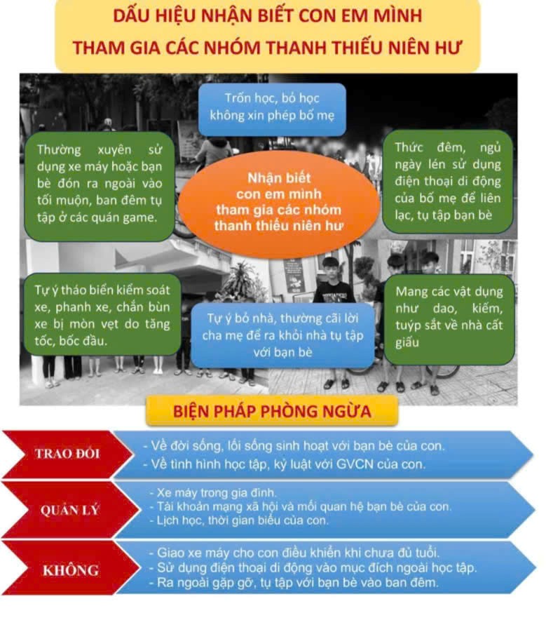 Công an xã cũng thường xuyên hướng dẫn phụ huynh tăng cường quản lý, nắm bắt tâm lý, tư tưởng của con em trong độ tuổi thanh thiếu niên. Các bậc cha mẹ được khuyến cáo cần có biện pháp giáo dục phù hợp, nhất là đối với những biểu hiện như bỏ học, tụ tập ban đêm, nghiện trò chơi điện tử, tham gia mạng xã hội với nội dung lệch chuẩn, sử dụng xe độ chế, mang theo hung khí… Đồng thời, phụ huynh không nên giao xe máy cho con khi chưa đủ điều kiện, cần quản lý việc sử dụng điện thoại, internet và mối quan hệ bạn bè của con em.