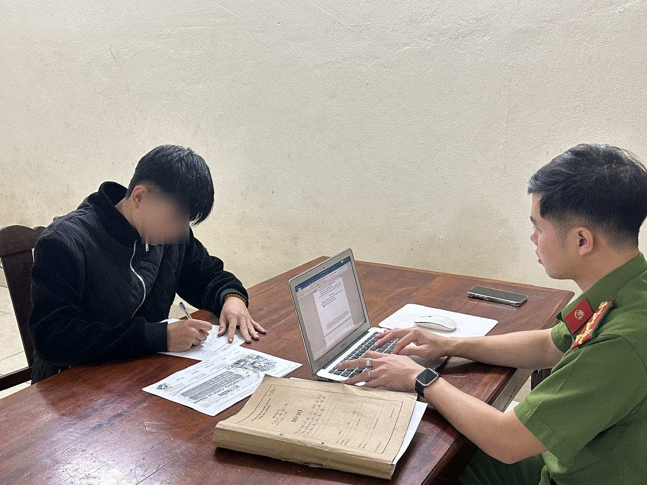 Đối tượng Đào Thế Việt làm việc với Điều tra viên tại Công an xã Thanh Ba