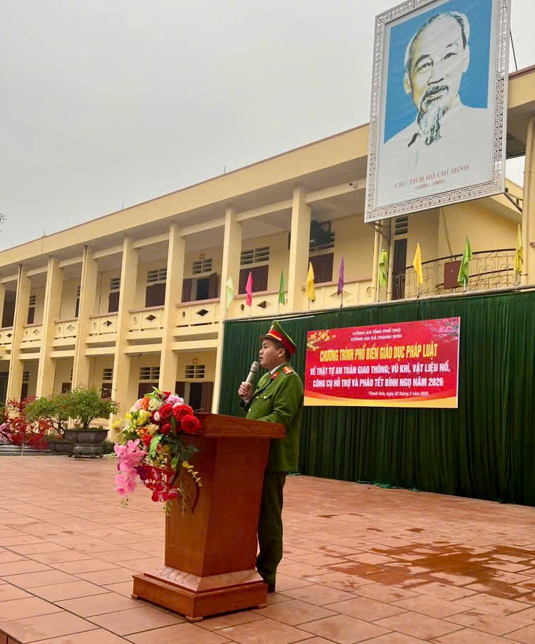 Công an xã Thanh Sơn tuyên truyền pháp luật về an toàn giao thông, vũ khí, pháo cho học sinh dịp Tết Tại các buổi tuyên truyền, cán bộ Công an xã trực tiếp phổ biến những quy định cơ bản, phù hợp với lứa tuổi học sinh. Trọng tâm là các quy định của pháp luật về trật tự an toàn giao thông đường bộ, đội mũ bảo hiểm khi tham gia giao thông, không điều khiển phương tiện khi chưa đủ tuổi, không tụ tập, dàn hàng ngang, lạng lách, đánh võng gây mất an toàn giao thông. Bên cạnh đó, học sinh được cung cấp thông tin về các hành vi bị nghiêm cấm trong chế tạo, tàng trữ, mua bán, vận chuyển, sử dụng trái phép vũ khí tự chế, đồ chơi nguy hiểm; các quy định về quản lý, sử dụng công cụ hỗ trợ.