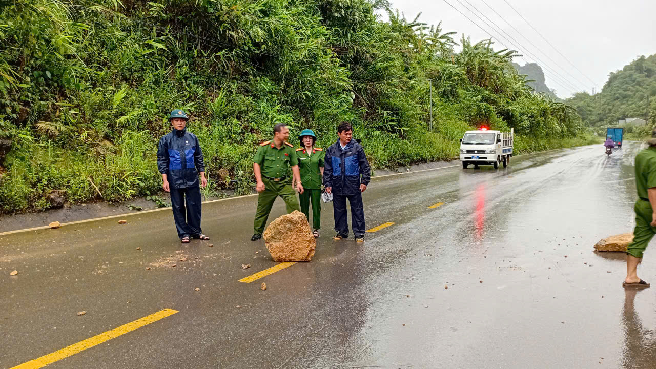 Trước diễn biến phức tạp và nguy hiểm của bão số 5, trên địa bàn xã Thung Nai, tỉnh Phú Thọ liên tục xảy ra mưa lớn kéo dài, tình trạng sạt lở đất, đá diễn ra ở nhiều điểm. Lực lượng Công an xã đã chủ động tổ chức các tổ tuần tra kiểm soát, đảm bảo công tác phòng chống lụt bão. Quá trình tuần tra, phát hiện tại Km13, tỉnh lộ 435 địa phận xã Thung Nai có nhiều khối đá lớn rơi xuống đường tiềm ẩn nguy cơ gây tai nạn giao thông và ách tắc giao thông. Công an xã và lực lượng ANTT ở cơ sở tiến hành dọn dẹp số đất đá bị sạt lở, đảm bảo giao thông thông suốt.