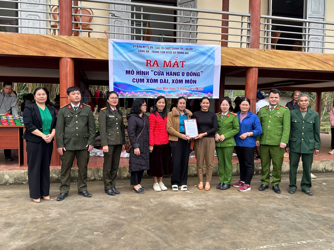 Hình ảnh Công an xã Ra mắt Mô hình con nuôi Công an xã Tiếp đó, ngày 31/12/2025, chương trình “Phiên chợ 0 đồng” với chủ đề “Gió ấm vùng cao” được tổ chức, hỗ trợ 102 hộ nghèo, cận nghèo tiếp cận 22 mặt hàng thiết yếu miễn phí; đồng thời trao 20 suất quà tiền mặt cho các hộ đặc biệt khó khăn. Tổng giá trị hỗ trợ hơn 71 triệu đồng.