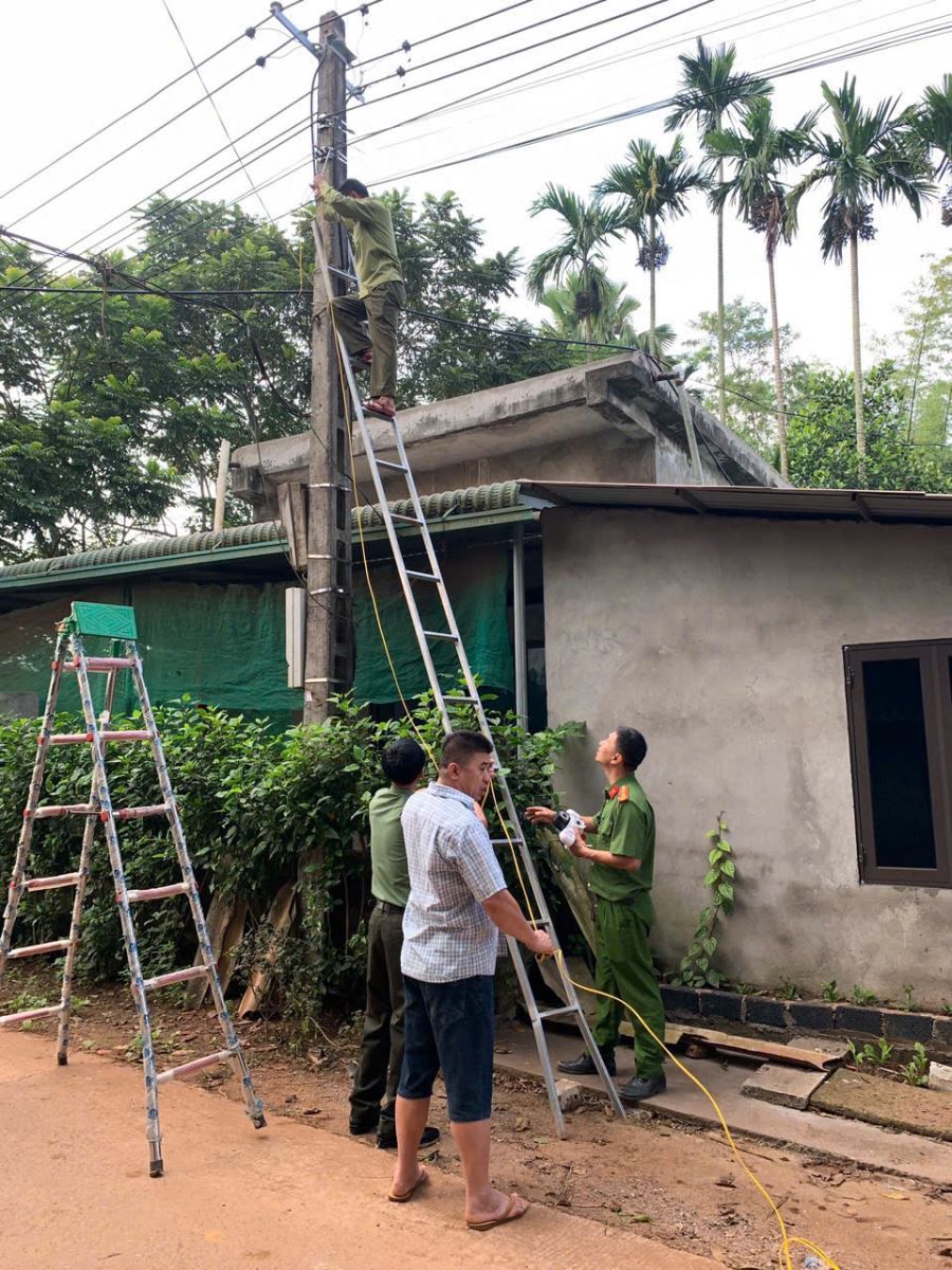Cán bộ CA xã phối hợp lắp đặt camera