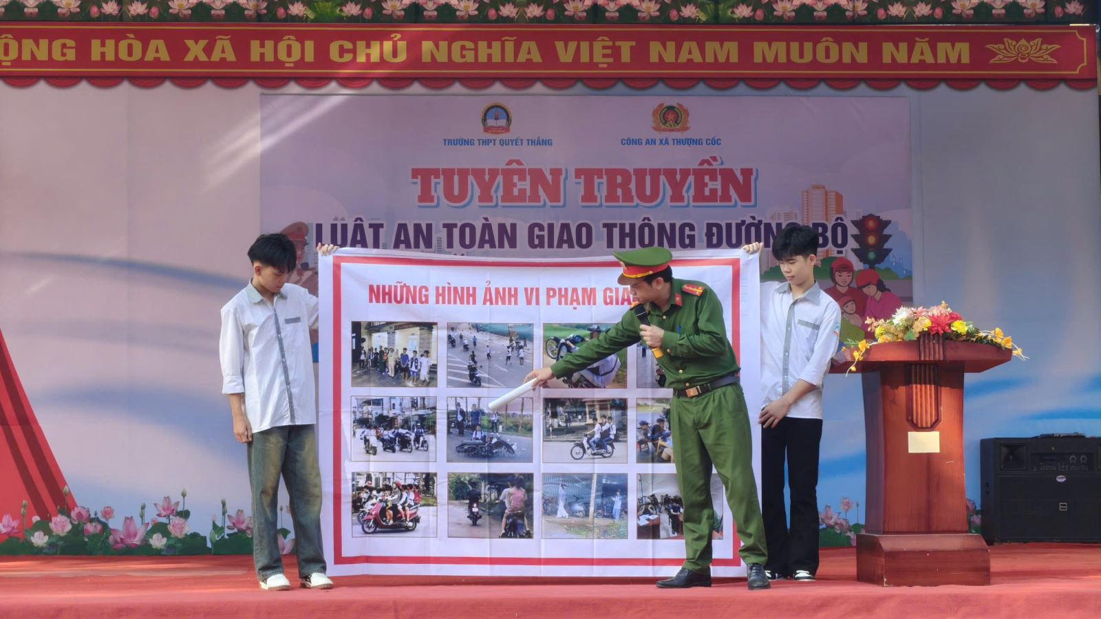 Ngày 13/10/2025, Công an xã Thượng Cốc ra quân phối hợp với các trường học trên địa bàn tổ chức hoạt động tuyên truyền, điều tiết giao thông tại cổng trường, nhắc nhở học sinh và phụ huynh chấp hành đúng quy định khi tham gia giao thông. Riêng tại Trường THPT Quyết Thắng, điểm tổ chức tuyên truyền trực tiếp, lực lượng Công an xã đã nhắc nhở 20 học sinh không đội mũ bảo hiểm, 25 học sinh sử dụng mũ không đạt chuẩn và đề nghị thay thế; đồng thời tổ chức buổi tuyên truyền pháp luật cho 30 giáo viên và hơn 450 học sinh về các nội dung: Luật Giao thông đường bộ, kỹ năng lái xe an toàn, hậu quả của hành vi vi phạm và trách nhiệm của mỗi người khi tham gia giao thông.