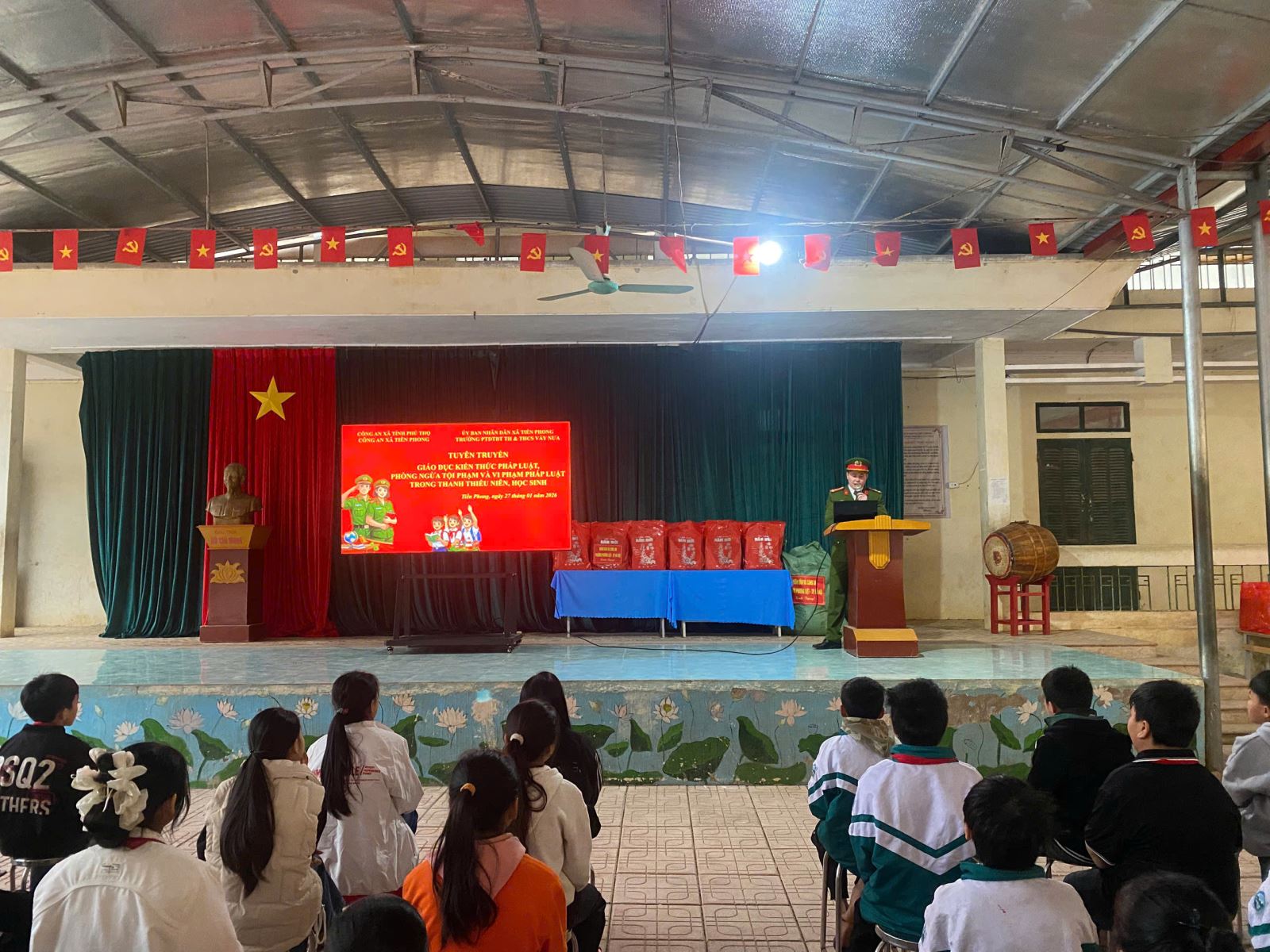 Nhằm nâng cao nhận thức pháp luật, trang bị kiến thức và kỹ năng cần thiết cho học sinh, góp phần xây dựng môi trường học đường an toàn, lành mạnh, vừa qua Công an xã Tiền Phong đã phối hợp với Trường Phổ thông Dân tộc Bán trú Tiểu học và Trung học cơ sở Vầy Nưa tổ chức buổi tuyên truyền, phổ biến, giáo dục pháp luật cho cán bộ, giáo viên và học sinh nhà trường.