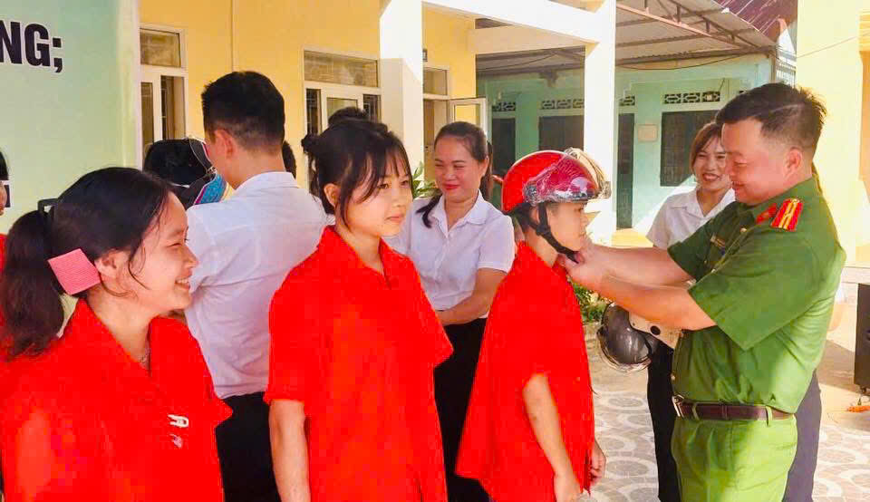 Nhân dịp này, Công an xã đã trao tặng mũ bảo hiểm đạt chuẩn cho đại diện học sinh các lớp của Trường Tiểu học và Trung học cơ sở Gia Mô.
