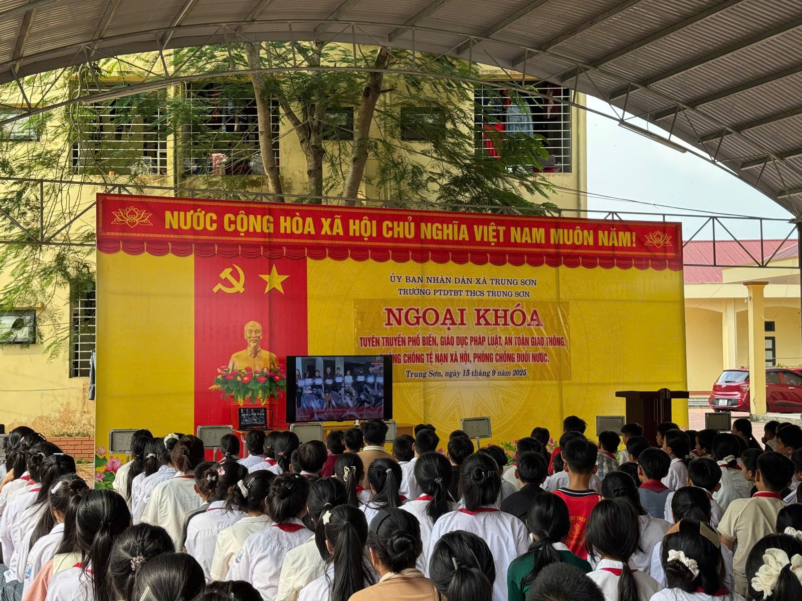 Thực hiện chương trình phối hợp giữa Công an xã Trung Sơn với các trường học trên địa bàn xã trong công tác đảm bảo an ninh trật tự, ngày 15/9/2025, Công an xã Trung Sơn đã phối hợp với Trường tiểu học Trung Sơn A tổ chức buổi ngoại khóa tuyên truyền, phổ biến pháp luật cho hơn 400 học sinh, cán bộ, giáo viên nhà trường.