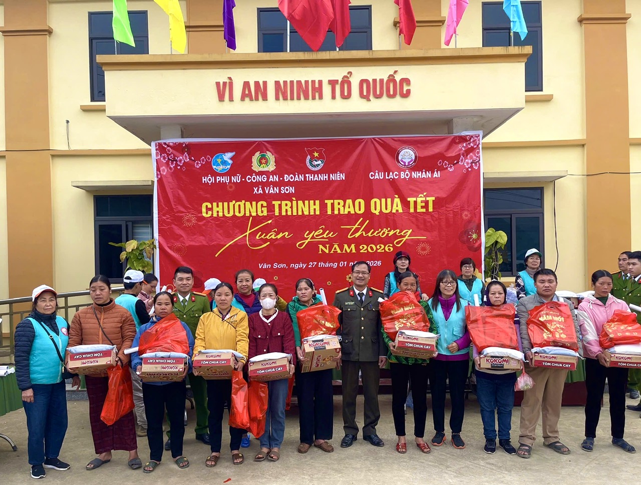 Sáng ngày 27/01/2026, Công an xã Vân Sơn phối hợp với Hội Phụ nữ, Đoàn Thanh niên xã Vân Sơn và Câu lạc bộ Nhân Ái tổ chức chương trình trao quà Tết “Xuân yêu thương” năm 2026 cho các hộ nghèo, cận nghèo và trẻ em có hoàn cảnh đặc biệt khó khăn trên địa bàn xã.