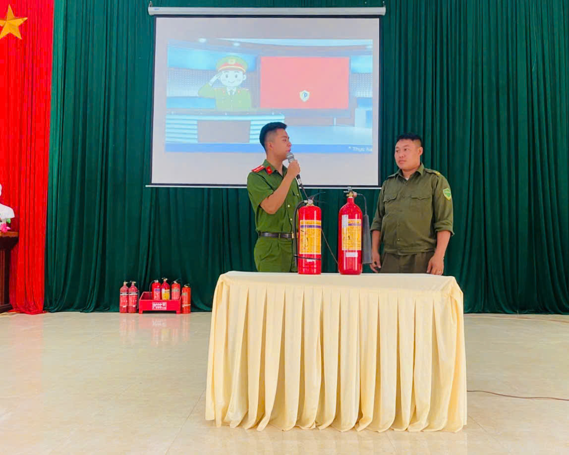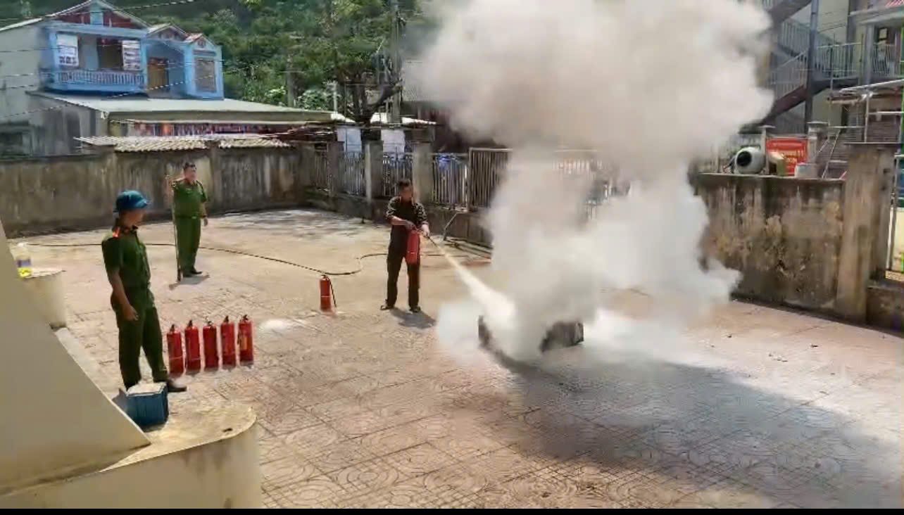 Công an xã Vân Sơn hướng dẫn sử dụng bình chữa cháy xách tay, dập tắt đám cháy giả định