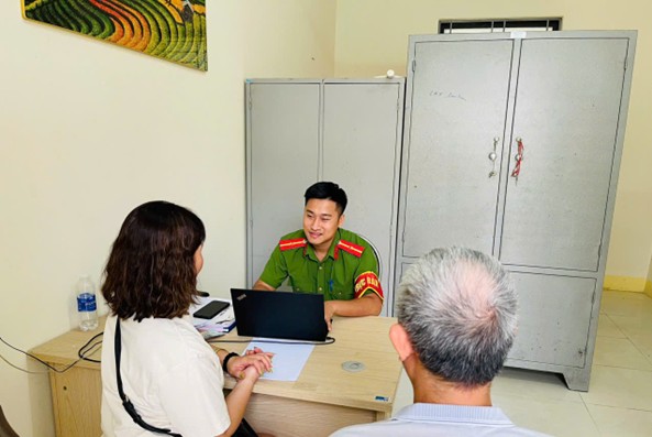 Chị Hường và ông Cường làm việc, trình báo vụ việc tại Công an xã Vạn Xuân