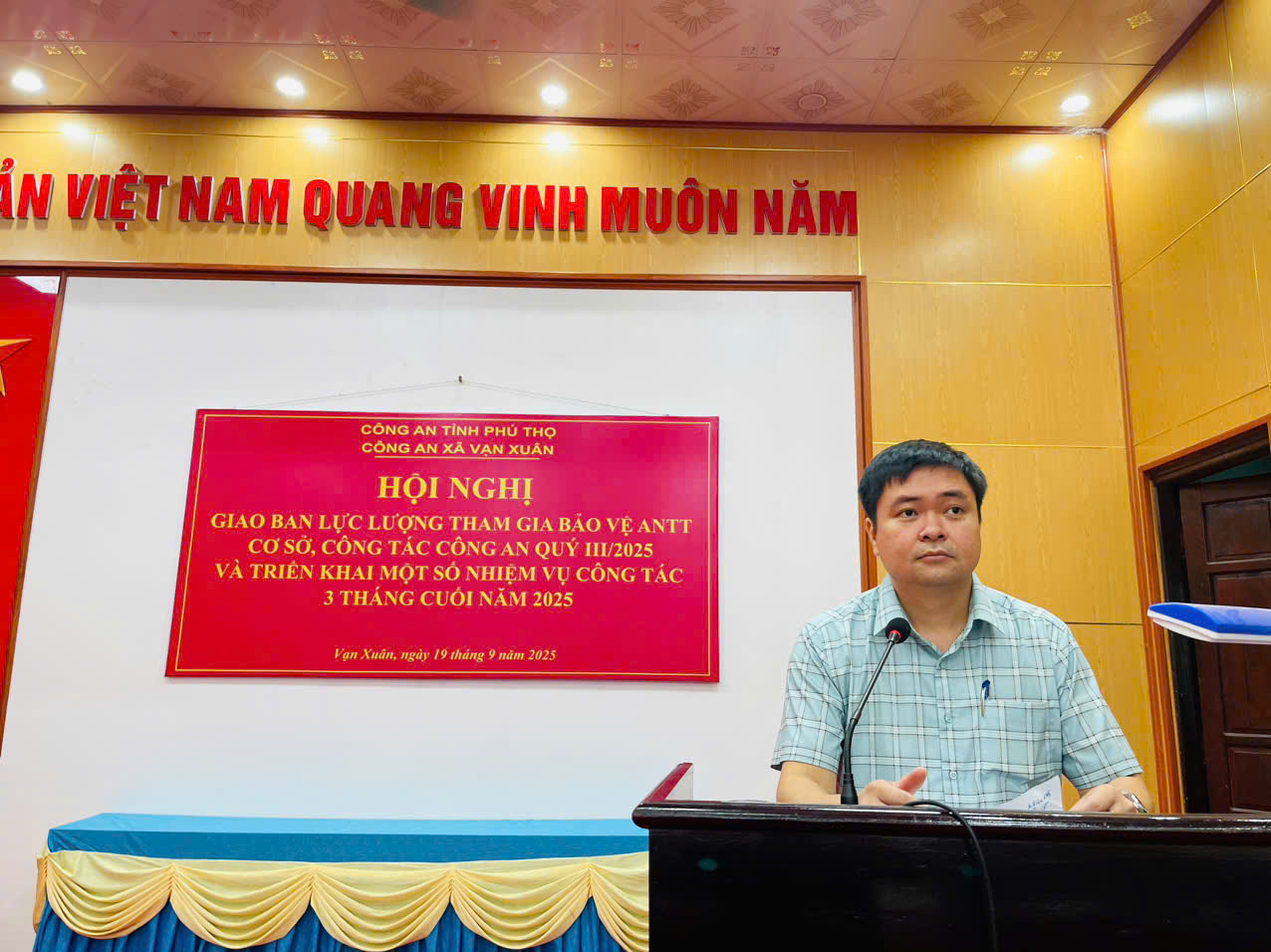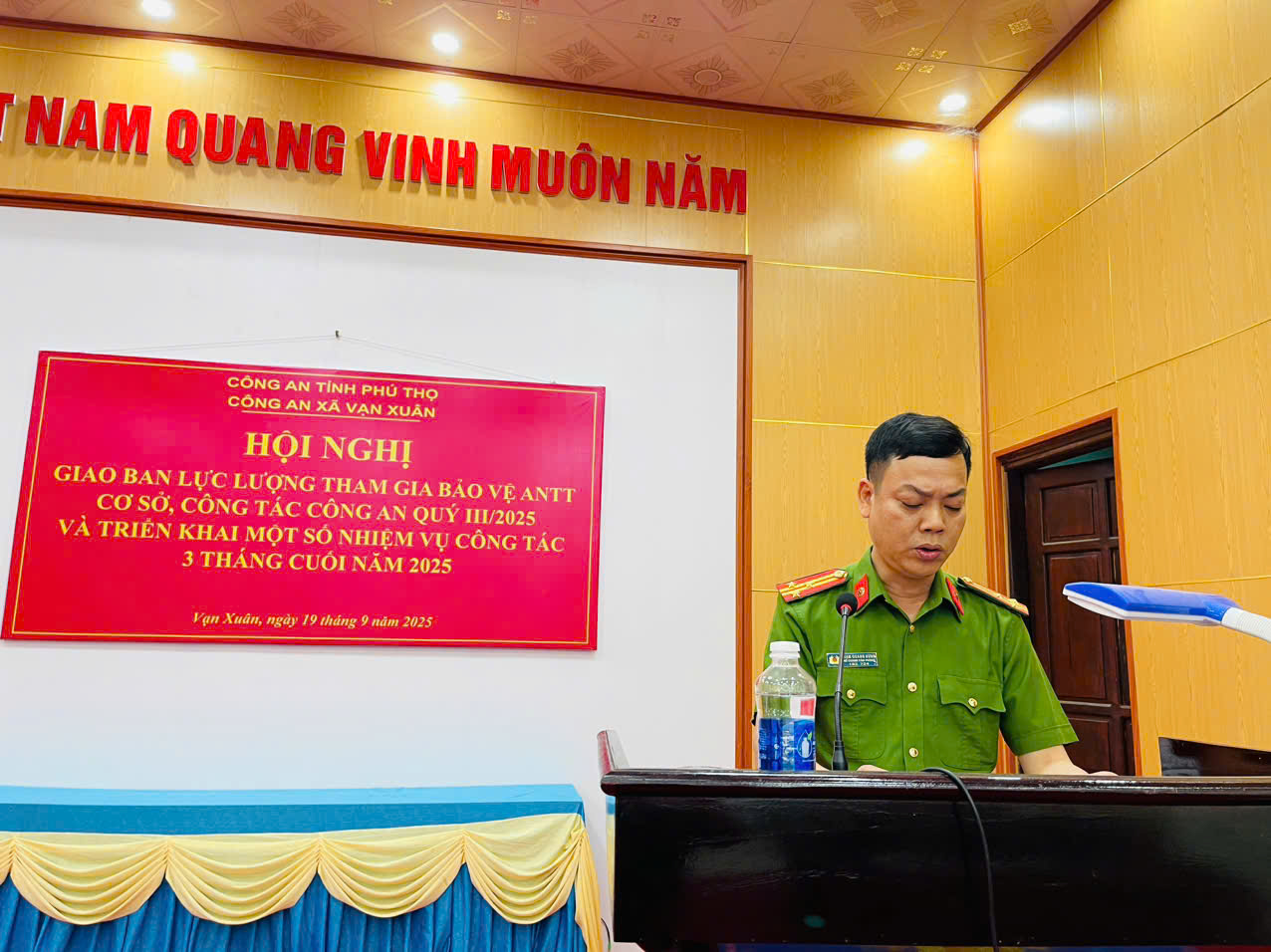 Chiều ngày 19/9/2025, Công an xã Vạn Xuân, tỉnh Phú Thọ tổ chức họp giao ban quý III/2025 và triển khai nhiệm vụ công tác 3 tháng cuối năm với lực lượng tham gia bảo vệ an ninh trật tự (ANTT) ở cơ sở. Tham dự buổi giao ban có đại diện lãnh đạo UBND xã Vạn Xuân; các đồng chí Chỉ huy Công an xã, toàn thể cán bộ, chiến sĩ Tổ Cảnh sát khu vực và 48 thành viên Tổ trưởng Tổ an ninh, trật tự cơ sở trên địa bàn xã.