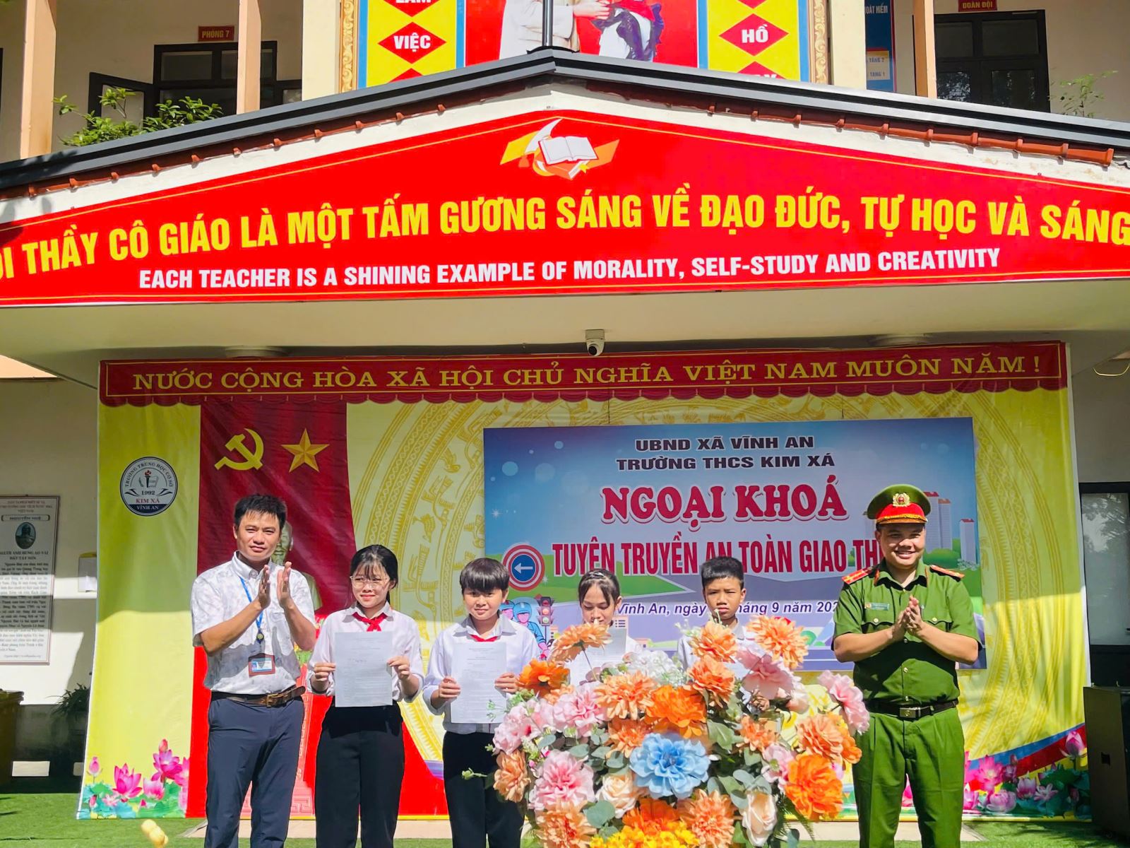 Nhằm nâng cao ý thức chấp hành pháp luật về trật tự an toàn giao thông trong học đường, góp phần phòng ngừa tai nạn giao thông, xây dựng văn hóa giao thông an toàn, ngày 03/10/2025, Công an xã Vĩnh An đã phối hợp với Trường Trung học cơ sở Kim Xá tổ chức buổi ngoại khóa tuyên truyền pháp luật về an toàn giao thông cho cán bộ, giáo viên, công nhân viên và toàn thể 833 học sinh nhà trường.